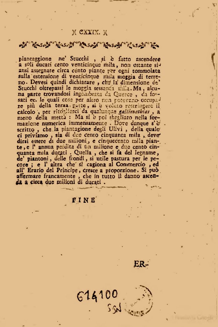 piantaggine ne' Stucchi , si b fatto ascendere a soli ducati cento venticinque' mila, non ostante si-' ansi assegnate circa cento piante r'er ogni tommolata sulla estensione di venticinque niiìa moggia di terreno- Devesi quindi dichiarare , ch'a la' dimensione de' Stucchi oltrepassi le moggia sessanta ii'dU. Ma , alcuna parte trovandosi ingombrata c!a Querce , da fossati ec. le quali cosa per altro non forerz.no- occupa re più delia tera». p«'.;e, si u voluto restringere il calcolo , per ritòglierci da qualunque galiimatbias , a meno della metta : Ma si è poi £h?c,Iiato nella formazione numerica immensamente . Dove dunque s'*et scritto , che. la piantagione degli Ulivi , delia quale ci priviamo , sia di due Cento cinquanta mila deve* dirsi essere di due milioni., e cinquecento mila pian-, te,e 1* annua perdita di lui milione e due cento cinquanta mila dus^ti • Quella , che si fa del legname, de' piantoni, delle fiondi, si utile pastura per le pecore ; e F altra che' si cagiona al Commercio , ed all' Erario del Principe, Cresce a proporzione. Si può. affermare francamente , che in tutto U danno ascea-a circa due milioni di ducati .