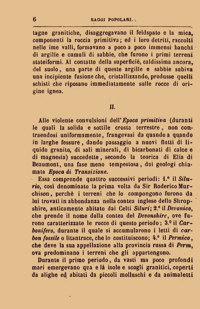 Alle violente convulsioni de\VEpoca primitiva (duranti le quali la solida e sottile crosta terrestre , non contraendosi uniformamente, frangevasi da quando a quando in larghe fessure, dando passaggio a nuovi fluiti di liquido granito, di sali minerali, di bicarbonati di calce e di magnesia) succedette, secondo la teorica di Elia di Beaumont, una fase meno tempestosa, dai geologi chiamata Epoca di Transizione.
