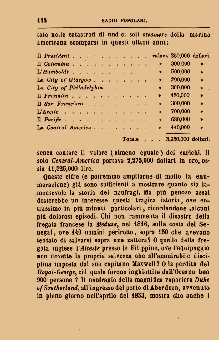 Queste cifre (e potremmo ampliarne di molto la enumerazione) già sono sufficienti a mostrare quanto sia lamentevole la storia dei naufragi. Ma più penoso assai desterebbe un interesse questa tragica istoria, ove entrassimo in più minuti particolari, ricordandone «alcuni più dolorosi episodi. Chi non rammenta il disastro della fregata francese la Medusa, nel 1816, sulla costa del Senegal, ove 140 uomini perirono, sopra 150 che avevano tentalo di salvarsi sopra una zattera? O quello della fregata inglese YAlceste presso le Filippine, ove l'equipaggio non dovette la propria salvezza che all'ammirabile disciplina imposta dal suo capitano Maxwell? O la perdita del Royal-George, còl quale furono inghiottite dall'Oceano ben 900 persone ? Il naufragio della magnifica vaporiera Duke of Southerland, all'ingresso del porto di Aberdeen, avvenuto in pieno giorno nell'aprile del 1853, mostra che anche iIl President.....