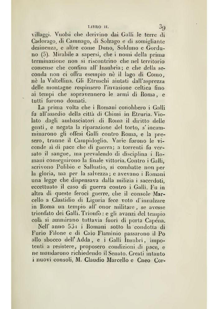 villaggi. Vuoisi che derivino dai Galli le terre di Cadorago, di Camnago, di Sol/ago e di somigliante desinenza, e altre come Duno, Solchino e Gordu-no (5). Mirabile a sapersi, che i nomi della prima terminazione non si riscontrino che nel territorio comense che confina all' Insubria ; e che della seconda non ci offra esempio ne il lago di Como, ṇ la Valtellina. Gli Etruschi aiutati dall'asprezza delle montagne respinsero l'invasione celtica fino ai tempi che sopravennero le armi di Roma, e tutti furono domati.