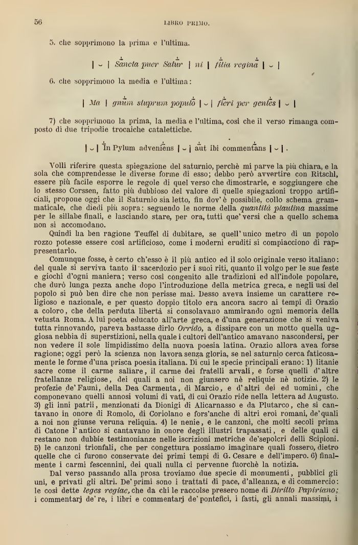 Quindi ha ben ragiono Teuffel di dubitare, se quell'unico metro di un popolo rozzo potesse essere così artificioso, come i moderni eruditi si compiacciono di rappresentarlo.