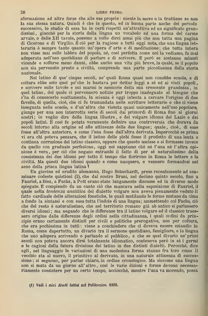 Un giovine ed erudito alemanno, Hugo Schuchardt, prese recentemente ad esaminare codeste quistioni (1), che dal nostro Bruni, nei decimo quinto secolo, fino a Fauriel, aDiez, a Fuchs, a Pott erano state lungamente discusse ed in diverso modo spiegate. E compiendo da un canto ciò che mancava nella esposizione di Fauriel, il quale nella tendenza analitica del dialetto volgare non aveva pienamente veduto il fatto cardinale delle alterazioni fonetiche, le quali mutilando le forme mutano da cima a fondo la sintassi e con essa tutta l'indole di una lingua ; ammettendo col Fuchs, ciò che del resto è naturalissimo, che nel territorio romano già ab antico si parlassero diversi idiomi ; ma negando che ìe differenze tra il latino volgare ed il classico traessero 01 ghie dalle differenze degli ordini nella cittadinanza, i quali ordini da principio erano certamente distinti per civili e politiche prerogative, non per coltura, che era pochissima in tutti: viene a conchiudere che ci doveva essere eziandio in Roma, come dapertutto, un divario tra il sermone quotidiano, famigliare, e la lingua che uno adopera scrivendo o parlando al pubblico, e che se quel divario ne'primi secoli non poteva ancora dirsi totalmente idiomatico, conteneva però in sè i germi e le cagioni della futura divisione dei latino in due distinti dialetti. Perocché, dice egli, nel linguaggio le variazioni di una medesima forma stanno fra loro come il vecchio sta al nuovo, il primitivo al derivato, in una naturale attinenza di successione ; si seguono, per parlar chiaro, in ordine cronologico. Ma siccome una lingua non si muta da un giorno all'altro, così le varie dizioni e forme devono necessariamente coesistere per un certo tempo, acciocché, mentre l'una va morendo, possa
