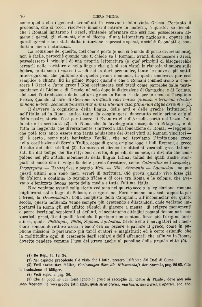 La soluzione del quesito, cosi com' è posto (e non ci è modo di porlo diversamente), non è facile, perocché quando uno ti chiede se i Romani, avanti di conoscere i Greci, possedessero i principii di una propria letteratura (e que' principii ci bisognerebbe cercarli nelle scritture e nella lingua che già si soli viste), la risposta ti muore sulle labbra, tanti sono i ma ed i se di cui la devi premunire, tante le nuove e più sottili interrogazioni, che pullulano da quella prima domanda, la quale sembrava pur così semplice e chiara. Ed in primo luogo: quand'è che i Romani cominciarono a conoscere i Greci e l'arte greca1? Non certamente così tardi come parrebbe dalle testimonianze di Licino e di Orazio, nè solo dopo la distruzione di Cartagine e di Corinto, che anzi l'introduzione della coltura greca in Roma risale per lo meno a Tarquinio Prisco, quando al dire di Cicerone « ìnfluxit non tennis quidam e Graecia rivulus in liane urbem, sed abundantissimus amnis illarum disciplinarum atquc artium » (1),,