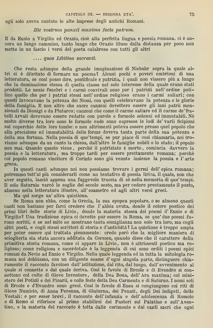 Che resta adunque della grande imaginazione di Niehulir sopra la quale altri si è dilettato di formare un poema1? Alcuni pochi e poveri embrioni di una letteratura, se così posso dire, pontificale e patrizia, i quali non vissero più a lungo che la dominazione stessa di quella classe nel solo interesse della quale erano stat: prodotti. Le nenie funebri e i carmi convivali sono per i patrizii nell' ordine politico quello che per i patrizi stessi nell'ordine religioso erano i carmi saliari; con questi invocavano la potenza dei Numi, con quelli celebravano la potenza e le glorie della famiglia. E non altro che sacre canzoni dovettero essere gli inni patrii menzionati da Dionigi e da Plutarco; canzoni che come il carme saliare ed il carme de'fratelli Arvali dovevano essere redatte con parole e forinole solenni ed immutabili. Nè molto diverse tra loro sono le formole onde sono espresse le lodi de'varìi Scipioni sul coperchio delle loro tombe: e non altrimenti poteva essere presso quel popolo che alla precisione ed immutabilità delle forme doveva tanta parte della sua potenza e della sua fortuna. Nella poesia di que'tempi, se pur piace di così chiamarla, noi troviamo adunque da un canto la chiesa, dall'altro le famiglie nobili o lo stato, il popolo non mai. Quando questo viene, perchè il patriziato è morto, comincia davvero la poesia e la letteratura, ma troppo tardi per essere prettamente romana; perchè col popolo romano vincitore di Corinto sono già venute insieme la poesia e l'arte greca.
