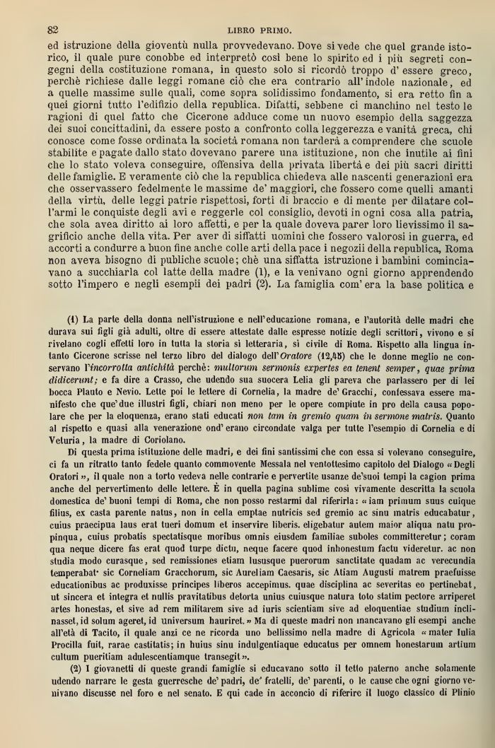 (2) I giovanetti di queste grandi famiglie si educavano sotto il tetlo paterno anche solamente udendo narrare le gesta guerresche de' padri, dcJ fratelli, de' parenti, o le cause che ogni giorno venivano discusso nel foro e nei senato. E qui cade in acconcio di riferire il luogo classico di Plinio