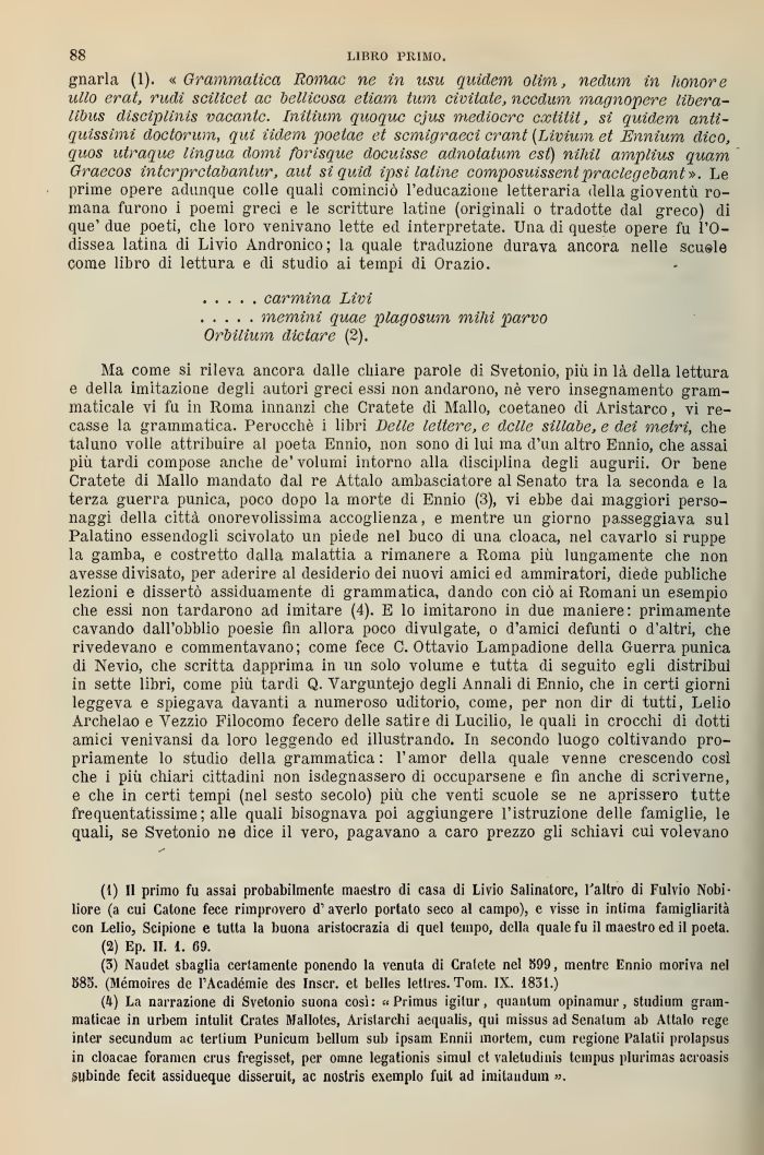 Ma come si rileva ancora dalle ciliare parole di Svetonio, più in là della lettura e della imitazione degli autori greci essi non andarono, nè vero insegnamento grammaticale vi fu in Roma innanzi che Cratete di Mallo, coetaneo di Aristarco, vi recasse la grammatica. Perocché i libri Delle lettere, e delle sillabe, e dei metri, che taluno volle attribuire al poeta Ennio, non sono di lui ma d'un altro Ennio, che assai più tardi compose anche de' volumi intorno alla disciplina degli augurii. Or bene Cratete di Mallo mandato dal re Attalo ambasciatore al Senato tra la seconda e la terza guerra punica, poco dopo la morte di Ennio (3), vi ebbe dai maggiori personaggi della città onorevolissima accoglienza, e mentre un giorno passeggiava sul Palatino essendogli scivolato un piede nel buco di una cloaca, nel cavarlo si ruppe la gamba, e costretto dalla malattia a rimanere a Roma più lungamente che non avesse divisato, per aderire al desiderio dei nuovi amici ed ammiratori, diede publiche lezioni e dissertò assiduamente di grammatica, dando con ciò ai Romani un esempio che essi non tardarono ad imitare (4). E lo imitarono in due maniere: primamente cavando dall'obblio poesie fin allora poco divulgate, o d'amici defunti o d'altri, che rivedevano e commentavano; come fece C.Ottavio Lampadione della Guerra punica di Nevio, che scritta dapprima in un solo volume e tutta di seguito egli distribuì in sette libri, come più tardi Q. Varguntejo degli Annali di Ennio, che in certi giorni leggeva e spiegava davanti a numeroso uditorio, come, per non dir di tutti, Lelio Archelao e Yezzio Filocomo fecero delle satire di Lucilio, le quali in crocchi di dotti amici venivansi da loro leggendo ed illustrando. In secondo luogo coltivando propriamente lo studio della grammatica: l'amor della quale venne crescendo così che i più chiari cittadini non isdegnassero di occuparsene e fin anche di scriverne, e che in certi tempi (nel sesto secolo) più che venti scuole se ne aprissero tutte frequentatissime ; alle quali bisognava poi aggiungere l'istruzione delle famiglie, le quali, se Svetonio ne dice il vero, pagavano a caro prezzo gli schiavi cui volevano