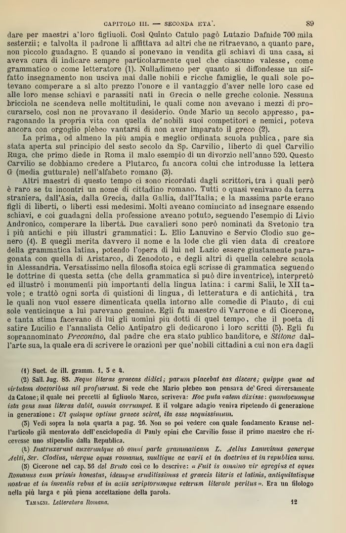 dare per maestri a'loro figliuoli. Così Quinto Catulo pagò Lutazio Dafnide 700 mila sesterzi; e talvolta il padrone li affittava ad altri che ne ritraevano, a quanto pare, non piccolo guadagno. E quando si ponevano in vendita gli schiavi di una casa, si aveva cura di indicare sempre particolarmente quel che ciascuno valesse, come grammatico o come letteratore (1). Nulladimeno per quanto si diiTondesse un siffatto insegnamento non lisciva mai dalle nohìli e ricche famiglie, le quali sole potevano comperare a sì alto prezzo l'onore e il vantaggio d'aver nelle loro case ed alle loro mense schiavi e parassiti nati in Grecia o nelle greche colonie. Nessuna bricciola ne scendeva nelle moltitudini, le quali come non avevano i mezzi di procurarselo, così non ne provavano il desiderio. Onde Mario un secolo appresso, paragonando la propria vita con quella de'nobili suoi competitori e nemici, poteva ancora con orgoglio plebeo vantarsi di non aver imparato il greco (2).