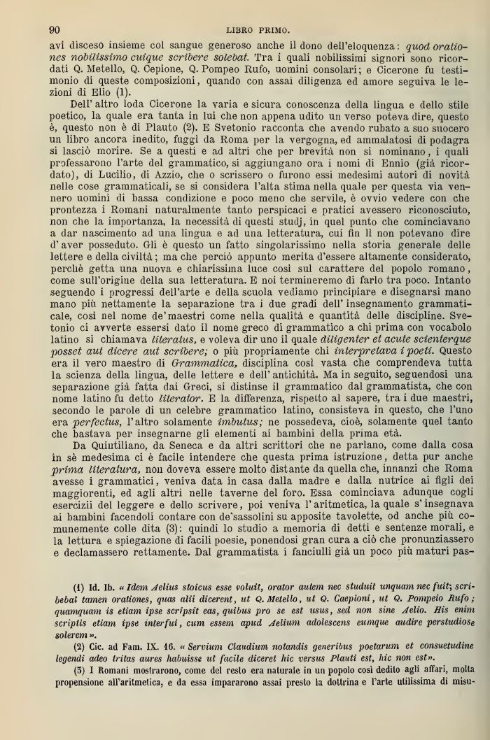 Dell' altro loda Cicerone la varia e sicura conoscenza della lingua e dello stilo poetico, la quale era tanta in lui che non appena udito un verso poteva dire, questo è, questo non è di Plauto (2). li Svetonio racconta che avendo rubato a suo suocero un libro ancora inedito, fuggì da Roma per la vergogna, ed ammalatosi di podagra si lasciò morire. Se a questi e ad altri che per brevità non si nominano, i quali professarono l'arte del grammatico, si aggiungano ora i nomi di Ennio (già ricordato), di Lucilio, di Azzio, che o scrissero o furono essi medesimi autori di novità nelle cose grammaticali, se si considera l'alta stima nella quale per questa via vennero uomini eli bassa condizione e poco meno che servile, è ovvio vedere con che prontezza i Romani naturalmente tanto perspicaci e pratici avessero riconosciuto, non che la importanza, la necessità di questi studj, in quel punto che cominciavano a dar nascimento ad una lingua e ad una letteratura, cui fin lì non potevano dire d'aver posseduto. G-li è questo un fatto singolarissimo nella storia generale delle lettere e della civiltà ; ina che perciò appunto merita d'essere altamente considerato, perchè getta una nuova e chiarissima luce così sul carattere del popolo romano, come sull'origine della sua letteratura. E noi termineremo di farlo tra poco. Intanto seguendo i progressi dell'arte e della scuola vediamo principiare e disegnarsi mano mano più nettamente la separazione tra ì due gradi dell' insegnamento grammaticale, così nel nome de'maestri come nella qualità e quantità delle discipline Svetonio ci avverte essersi dato il nome greco di grammatico a chi prima con vocabolo latino si chiamava literatus, e voleva dir uno il quale diligenter et acute scienlerque possct aut dicere aut scribere; o più propriamente chi interpretava i poeti. Questo era il vero maestro di Grammatica, disciplina cosi vasta che comprendeva tutta la scienza della lingua, delle lettere e dell' antichità. Ma in seguito, seguendoci una separazione già fatta dai Greci, sì distinse il grammatico dal grammatista, che con nome latino fu detto literator. E la differenza, rispetto al sapere, tra i due maestri, secondo le parole di un celebre grammatico latino, consisteva in questo, che l'uno era perfectus, l'altro solamente imbutus, ne possedeva, cioè, solamente quel tanto che bastava per insegnarne gli elementi ai bambini della prima età.