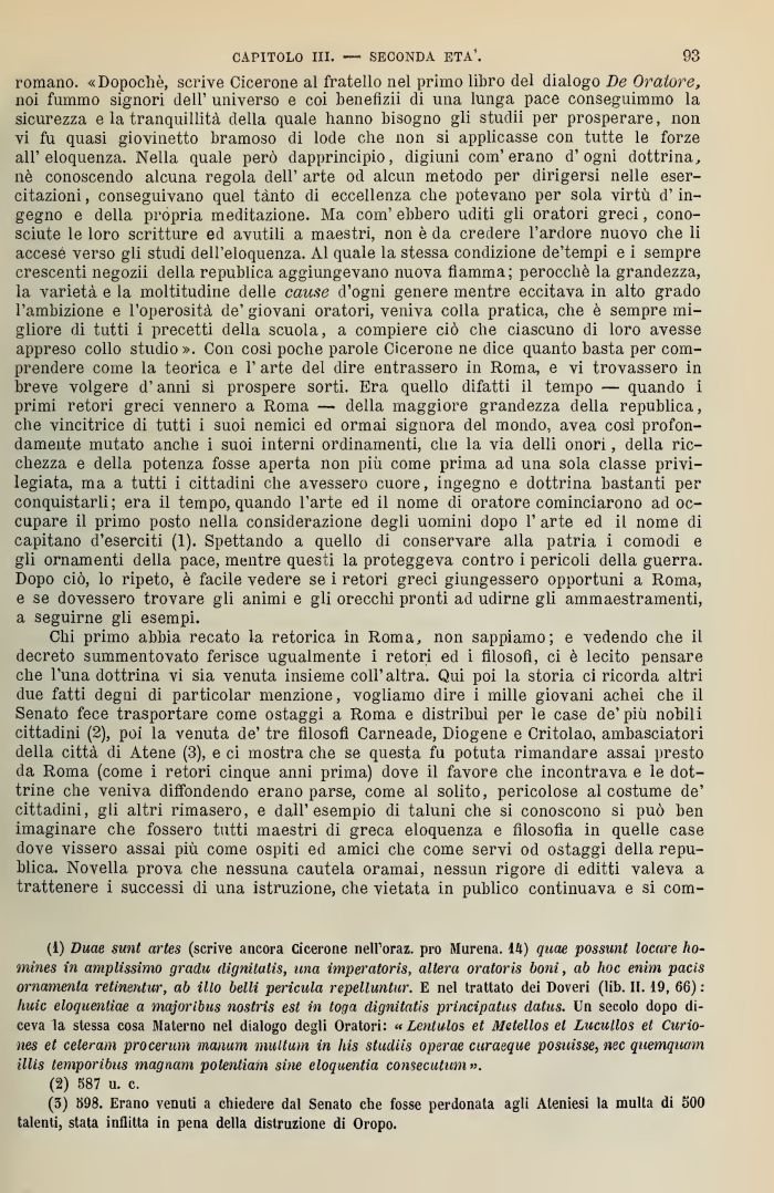 Chi primo abbia recato la retorica in Roma, non sappiamo; e vedendo che il decreto summentovato ferisce ugualmente i retori ed i filosofi, ci è lecito pensare che l'una dottrina vi sia venuta insieme coli' altra. Qui poi la storia ci ricorda altri due fatti degni di particolar menzione, vogliamo dire i mille giovani achei che il Senato fece trasportare come ostaggi a Roma e distribuì per le case de' più nobili cittadini (2), poi la venuta de' tre filosofi Cameade, Diogene e Critolao, ambasciatori della città di Atene (3), e ci mostra che se questa fu potuta rimandare assai presto da Roma (come i retori cinque anni prima) dove il favore che incontrava e le dottrine che veniva diffondendo erano parse, come al solito, pericolose al costume de' cittadini, gli altri rimasero, e dall'esempio di taluni che si conoscono si può ben imaginare che fossero tutti maestri di greca eloquenza e filosofia in quelle case dove vissero assai più come ospiti ed amici che come servi od ostaggi della republica. Novella prova che nessuna cautela oramai, nessun rigore di editti valeva a trattenere i successi di una istruzione, che vietata in publico continuava e si com-