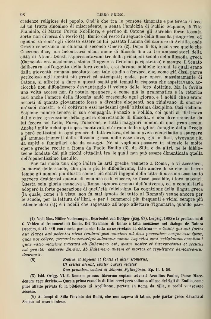 credenze religiose del popolo. Ond' è che tra le persone timorate e pie Greco si fece ad un tratto sinonimo di miscredente, e senza l'amicizia di Publio Scipione, di Tito Flaminio, di Marco Fulvio Nobiliore, e perfino di Catone gli sarebbe forse toccata sorte non diversa da Nevio (1). Ennio del resto fu seguace della filosofìa pitagorica, ed ognuno sa coni' egli dicesse essere in lui passata l'anima del cantore di Achille, onde Orazio scherzando lo chiama il secondo Omero (2). Dopo di lui, è poi vero quello che Cicerone dice, non incontrarsi alcun nome di filosofo fino ai tre ambasciatori della città di Atene. Questi rappresentavano tre delle principali scuole della filosofia greca (Cameade era academico, stoico Diogene e Critolao peripatetico) e mentre il Senato deliberava sull'oggetto della loro venuta, essi davano luMche lezioni, le quali erano dalla gioventù romana ascoltate con tale studio e fervore, che, come già dissi, parve pericoloso agli uomini più gravi ed attempati; onde, per opera massimamente di Catone, si affrettò a dare a questi ospiti già temuti la risposta che aspettavano, acciocché non diffondessero davvantaggio il veleno delle loro dottrine. Ma la favilla una volta accesa non fu potuta spegnere, e come già la grammatica e la retorica così anche l'amore della filosofìa andò crescendo ogni giorno, e i nobili che s'erano accorti di quanto giovamento fosse a divenire eloquenti, non rifinivano di onorare ne' suoi maestri e di coltivare essi medesimi quell' altissima disciplina. Così vediamo Scipione minore tenere in sua compagnia Panezio e Polibio, coi quali si distraeva dalle cure gravissime della guerra conversando di filosofia, e non diversamente da lui fecero poi Lelio, Furio, Tuberone, e tutti i maggiori uomini di quel gran secolo. Anche i mille Achei qui sopra mentovati, eh' erano delle migliori famiglie della Grecia e però coltissimi in ogni genere di letteratura, debbono avere contribuito a spargere gli ammaestramenti della filosofia greca nelle case dove, già lo dissi, vivevano più da ospiti e famigliari che da ostaggi. Nè si vogliono passare in silenzio le molte opere greche recate a Roma da Paolo Emilio (3), da Siila e da altri, nè le biblioteche fondate dai più ricchi cittadin., tra le quali non può essere dimenticata quella dell'opulentissimo Lucullo.
