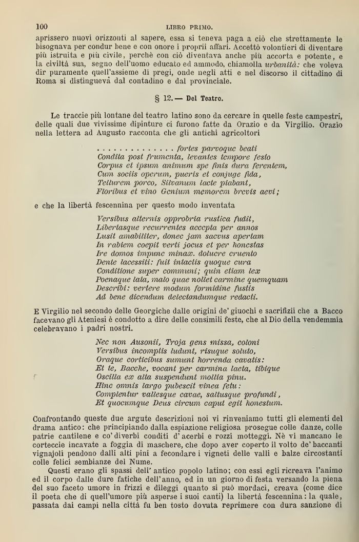 Le traccie più lontane del teatro latino sono da cercare in quelle feste campestri, delle quali due vivissime dipinture ci furono fatte da Orazio e da Virgilio. Orazio nella lettera ad Augusto racconta che gli antichi agricoltori