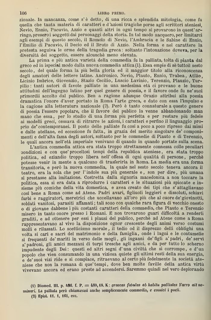 (1) Dionied. III. p. ftsJ f. P. = 489,18. K: graecas fabulas ab habitu palliata9 farro ait, nominavi. La palliata però cliianiavasi anche semplicemente commedia, e comici i poeti.