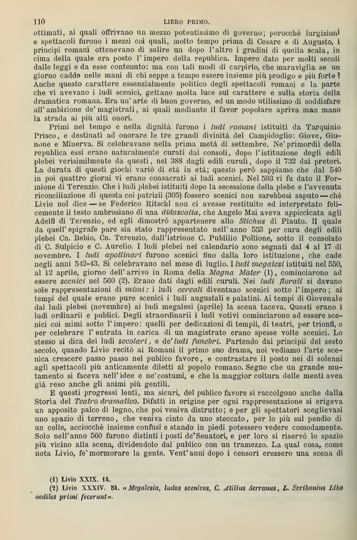 E questi progressi lenti, ma sicuri, del publico favore si raccolgono anche dalla Storia del Teatro dramatico. Difatti in origine per ogni rappresentazione si erigeva un apposito palco di legno, che poi veniva distrutto; e per gli spettatori sceglievasi uno spazio di terreno, che veniva cinto da uno steccato, per lo più sul pendìo di un colle, acciocché insieme confusi e stando in piedi potessero vedere comodamente. Solo nell'anno 560 furono distinti i posti de'Senatori, e per loro si riservò lo spazio più vicino alla scena, di adendolo dal publico con un tramezzo. La qual cosa, come nota Livio, fe'mormorare la gente. Yent'anni dopo i censori eressero una scena di