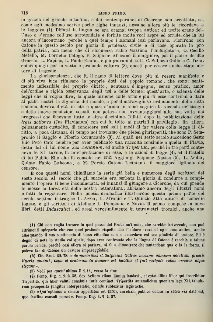 La giurisprudenza, che fu il ramo di lettere dove più si resero manifeste e di più viva luce rifulsero le proprie doti del popolo romano, che sono: senti mento inllessibile del proprio diritto, acutezza d'ingegno, senso pratico, amor dell'ordine e rigida osservanza degli usi e delle forme ; quest' arte, o scienza delle leggi che si voglia dire, la quale insieme colle armi e più di esse contrìbui a dare ai padri nostri la signoria del mondo, e per il maraviglioso ordinamento della città romana doveva d'età in età e quasi d'anno in anno seguire la vicenda de'bisogni e dello nuove condizioni sociali, non poteva non avvantaggiarsi alla sua volta dei progressi che facevano tutte le altre discipline. Difatti dopo la pubblicazione delle legis actiones (Jus Flavianum) con cui fu tolto ai patrizii il privilegio, fin allora gelosamente custodito, di conoscere essi soli i modi di far valere colla legge il diritto, a poca distanza di tempo noi troviamo due plebei giurisperiti, che sono P. Sempronio il Saggio e Tiberio Coruncanio (3). Ai quali nel sesto secolo succedono Sesto Elio Peto Cato celebre per aver publicato una raccolta consimile a quella di Flavio, detta dal di lui nome Jus Aelianum, ed anche Tripertita, perchè in tre parti conteneva le XII tavole, la interpretazione di esse, e le azioni di legge (4), ed il fratello di lui Publio Elio che fu console nel 552. Aggiungi Scipione Nasica (5), L. Acilio, Quinto Fabio Labeone, e M. Porcio Catone Liciniano, il maggiore figliuolo del censore.