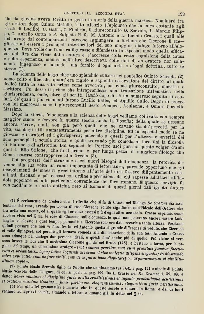 Dopo la storia, l'eloquenza e la scienza delie leggi vediamo coltivata con sempre inagc 01 studio e f. -vore in queste secolo anche la filosofia; della quale se ssuno ancori s< ive, molti son già però quelli che ne cavano sia de'pr.ee ti .er la vita, sia degl; utili ammaestramenti per altre discipline. Ed in ispeca 7. ,d0 5e ne gi( mno gli oratori ed i giurisperiti; piacendo a questi per l'altera e severità dei suoi principi! 1 scuota stoica, e quelli trovando più comoda ai loro fini li .sofia di Platone e di Aristotile, ai seguaci del Portico uscì pure in questo voi r ni quel L. Eli St one, che fu il primo 3 per lunga pezza il m ggiore fi fogo che Roma potesse contrapporre alla Grecia (3).