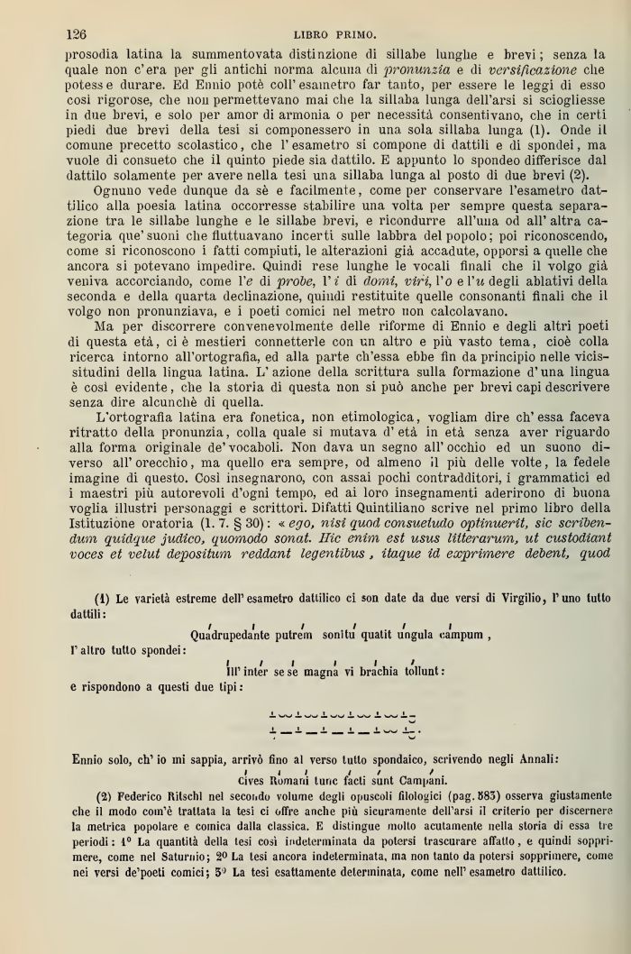 (2) Federico Ritschl nel secondo volume degli opuscoli filologici (pag. 883) osserva giustamente che il modo com'è trattata la tesi ci offre anche più sicuramente dell'arsi il criterio per discernere la metrica popolare e comica dalla classica. E distingue mollo acutamente nella storia di essa tic periodi : 1° La quantità della ìesi così indeterminata da potersi trascurare affatlo, e quindi sopprimere, come nel Saturnio; La tesi ancora indeterminata, ma non tanto da potersi sopprimere, come nei versi de'poeti comici; 3'» La tesi esattamente determinata, coinè ncH'esamelro datt 'ico.