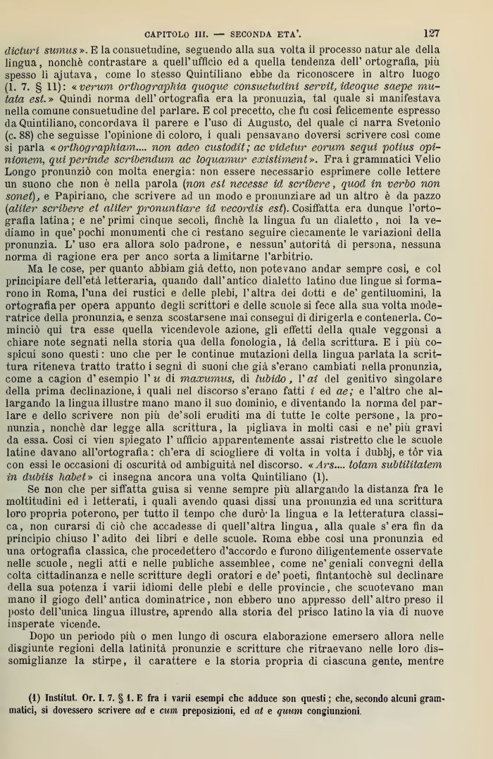 Ma le cose, per quanto abbiam già detto, non potevano andar sempre così, e col principiare dell'età letteraria, quando dall'antico dialetto latino due lingue si formarono in Roma, l'una dei rustici e delle plebi, l'altra dei dotti e de'gentiluomini, la ortografia per opera appunto degli scrittori e delle scuole si fece alla sua volta moderatrice della pronunzia, e senza scostarsene mai consegui di dirigerla e contenerla. Cominciò qui tra esse quella vicendevole azione, gli effetti della quale veggonsi a chiare noto segnati nella storia qua della fonologia, là della scrittura. E i più cospicui sono questi : uno che per le continue mutazioni della lingua parlata la scrittura riteneva tratto tratto i segni di suoni che già s'erano cambiati nella pronunzia, come a cagion d'esempio 1' u di maxumus, di lubido, V ai del genitivo singolare della prima declinazione, i quali nel discorso s'erano fatti i ed ae; e l'altro che allargando la lingua illustre mano mano il suo dominio, e diventando la norma del parlare e dello scrivere non più de'soli eruditi ma di tutte le colte persone, la pronuncia, nonché dar legge alla scrittura, la pigliava in molti casi e ne'più gravi da essa. Così ci vien spiegato 1' ufficio apparentemente assai ristretto che le scuole latine davano all'ortografia : ch'era di sciogliere di volta in volta i dubbj, e tór via con essi le occasioni di oscurità od ambiguità nel discorso. « Ars.... totam subtilitatem in dubiis habet» ci insegna ancora una volta Quintiliano (1).