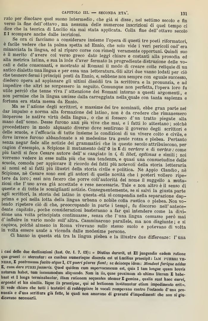 i cas dellt due declinazioni (Inst. Or. 1. 7. 18) : « Diutius duravit, ut EI jungendis cadcm ratione quagr 3ci zi uterentur: ea casibus numerisque discreta esl ut Lucilius pnecipit: Iam puerei venere, E voslremum facito atqml, Ut pueri plures fiant; ac deinceps idem: Mendaci furique addas E, cum dare flrei jasseris. Quod quidern cum supervacaneum est, quia I tara longae pi m brevis naturam .ìabet, tuni incommodum aliquando. Nam in iis, quae proximam ab ultima liter_.n E habe-bant e I longa terrainabaiilur, illam rationem sequentes utemur E gemina, qualia sunt hacc aurei, argentei e. his s ni Kque iis praecipue, qui ad lectionem instituuntur etiam impedimento erit». Si vtae chiaro che tutti i tentativi di raddoppiare le vocali rompevano contro foslicolo d'una pro-unzia e d'una scrittura già fatte, le quali non amavano di gravarsi d'impedimenti che non s u-dicavano necessarii.