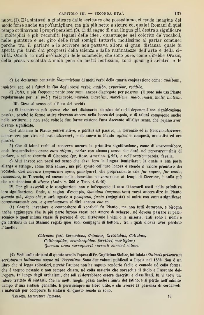 (2) Vedi sulla sintassi di questo secolo l'opera di Fr. Guglielmo Stoltze, intitolata : Sintaxìspriseorum scriptorum latinorum usque ad Terentium. Sono due volumi pnblicati a Lipsia nel 1862 Non è un libro che si legga volontieri, perchè l'autore non ha saputo renderlo facile e comodo ne colla forma, che è troppo pesante e non sempre chiara, nè colla materia che soverchia il titolo e l'assunto dell'opera. In luogo degli archaismi, che soli vi dovrebbero essere descritti e classificati, tu vi trovi un intero trattato di sintassi, che in molti luoghi passa anche i limiti del latino, e si perde nell'infinito campo d'una sintassi generale. E però sempre un libro utile, e chi avesse la pazienza di cercarveli