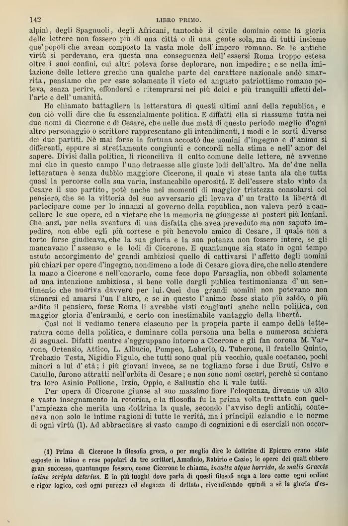 Cosi noi li vediamo tenere ciascuno per la propria parte il campo dolla letteratura come della politica, e dominare colla persona una bella e numerosa schiera di seguaci. Difatti mentre s'aggruppano intorno a Cicerone e g.i fan corona M. Var-rone, Ortensio, Attico, L. Albucio, Pompeo, Laberio, Q. Tuberone, il fratello Quinto, Trebazio Testa, Nigidio Figulo, che tutti sono qual più vecchio, quale coetaneo, pochi minori a lui d' età ; i più giovani invece, se ne togliamo forse i due Bruti, Calvo e Catullo, furono attratti nell'orbita di Cesare ; e non sono nomi oscuri perchè si contano tra loro Asinio Pollione, Irzio, Oppio, e Sallustio che li vale tutti.
