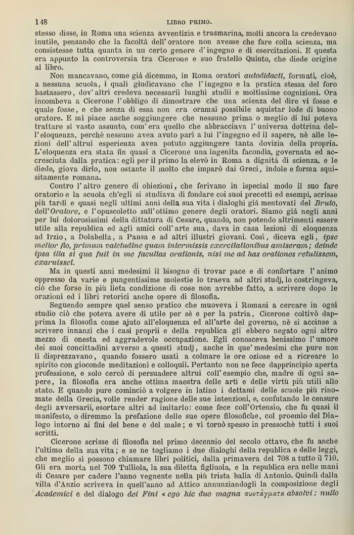 Non mancavano, come già dicemmo, in Roma oratori autodidacti, formati, cioè, a nessuna scuola, i qualj giudicavano clic l'ingegno e la pratica stessa del foro bastassero, dov'altri credeva necessarii lunghi studii e moltissime cognizioni. Ora incombeva a Cicerone l'obbligo di dimostrare che una scienza del dire vi fosse e quale fosse, e che senza di essa non era oramai possibile aquistar lode di buono oratore. E mi piace anche soggiungere che nessuno prima o meglio di lui poteva trattare sì vasto assunto, com' era quello che abbracciava 1' universa dottrina dell'eloquenza, perchè nessuno avea avuto pari alni l'ingegno ed il sapere, nè alle lezioni dell' altrui esperienza avea potuto aggiungere tanta dovizia della propria. L'eloquenza era stata fin quasi a Cicerone una ingenita facondia, governata ed accresciuta dalla pratica: egli per il primo la elevò in Roma a dignità di scienza, e le diede, giova dirlo, non ostante il molto che imparò dai Greci, indole e forma squisitamente romana.