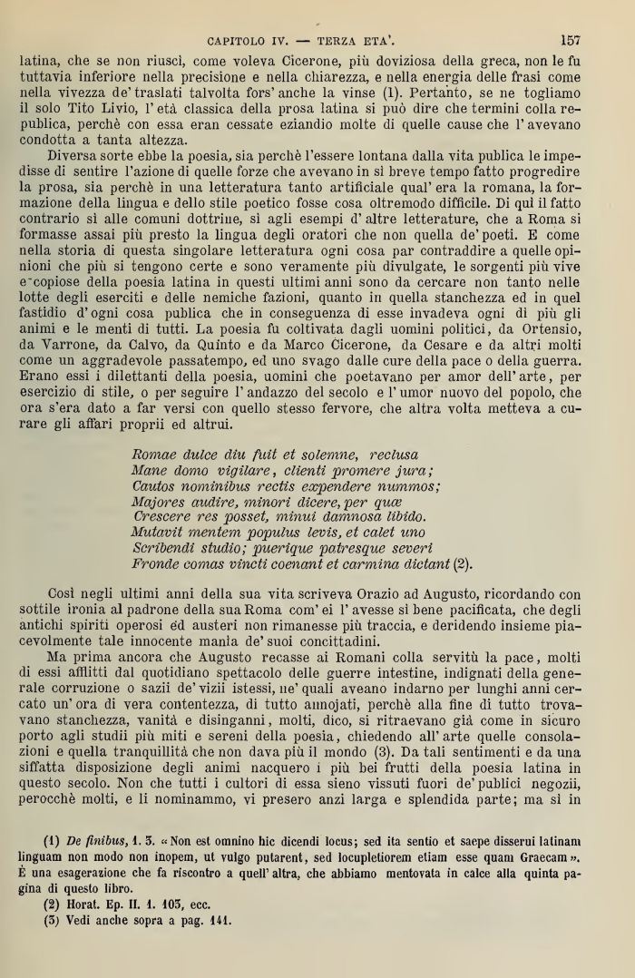 Ma prima ancora che Augusto recasse ai Romani colla servitù la pace, molti di essi afflitti dal quotidiano spettacolo delle guerre intestine, indignati della generale corruzione o sazii de'viz istessi, ne'quali aveano indarno per lunghi anni cercato un' ora di vera contentezza, di tutto annojati, perchè alla fine di tutto trovavano stanchezza, vanità e disinganni, molti, dico, si ritraevano già come in sicuro porto agli studii più miti e sereni della poesia, chiedendo all' arte quelle consolazioni e quella tranquillità che non dava più il mondo (3). Da tali sentimenti e da una siffatta disposizione degli animi nacquero i più bei frutti della poesia latina in questo secolo. Non che tutti i cultori di essa sieno vissuti fuori de'publici negozii, peroccLì molti, e li nominammo, vi presero anzi larga e splendida parte; ma si in
