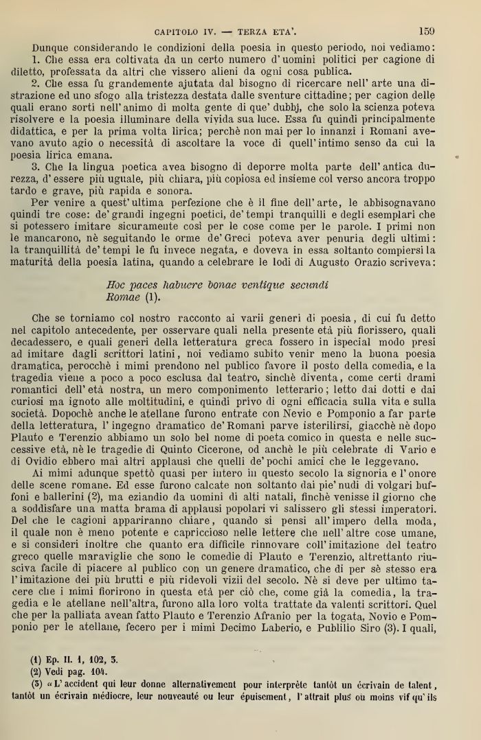 Che se torniamo col nostro racconto ai vara generi di poesia, di cui fu detto nel capitolo antecedente, per osservare qual1 nella presente età più fiorissero, quali decadessero, e quali generi della letteratura greca fossero ìli ispecial modo presi ad imitare dagli scrittori latini, noi vediamo subito venir meno la buona poesia dramatica, perocché i mimi prendono liei publico favore il posto della comedia, e la tragedia viene a poco a poco esclusa dal teatro, sinché diventa, come certi drami romantici dell' età nostra, un mero componimento letterario ; letto dai dotti e dai curiosi ma ignoto alle moltitudini, e quindi privo di ogni efficacia sulla vita e sulla società. Dopoché anche le atellane furono entrate con Nevio e Pomponio a far parte della letteratura, l'ingegno dramatìco de'Romani parve isterilirsi, giacché nè dopo Plauto e Terenzio abbiamo un solo bel nome di poeta comico in questa e nelle successive età, nè le tragedie di Quinto Cicerone, od anchè le più celebrate di Vario e di Ovidio ebbero mai altri applausi che quelli de'pochi amici che le leggevano.