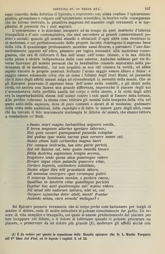 (1) È da vedere per questo la esposizione della filosofia epicurea che fa L. Manlio Torquato nel 1° libro Dei Fini, ed in ispccie i capitoli X ed X