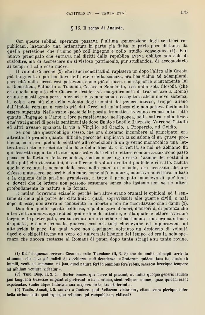 Con queste sublimi speranze passava f ultima generazione degli scrittori re-publicani, lasciando una letteratura in parte già fluita, in parte poco distante da quella perfezione che l'uomo può coli'ingegno e collo studio conseguire (1). E il nuovo principato che entrava nei diritti della republica aveva obbligo non solo di custodire, ma di accrescere un sì vistoso patrimonio, pur studiandos di accomodarlo ai tempi ed alle cose nuove.
