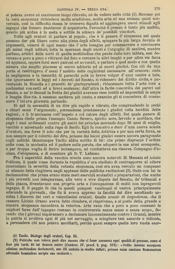 Fra i superstiti della vecchia scuola sono ancora notevoli M. Messala ed Asinio Pollione, il quale come durante la republica s' era studiato di contrapporre al nitore ciceroniano la severità della vetusta eloquenza, così ora avea cercato un compenso al silenzio della ringhiera negli applausi delle publiche recitazioni (2). Onde con lui le declamazioni che prima erano state meri esercizii scolastici o preparazioni, che anche i più provetti non sdegnavano, alle vere e vive dispute del Senato, de' tribunali e della piazza, diventavano una propria arte e l'occupazione di molti non ispregevoli ingegni. E il peggio fu che in questi pomposi vaniloquii si veniva principalmente educando la gioventù, che fin lì aveva appreso la facoltà del dire ascoltando assidua i discorsi dei veri e valentissimi oratori. Quelle scuole di impudenza, che il censore Licinio Crasso aveva fatto chiudere, si riaprivano, e al posto della grande e sincera eloquenza succedeva la retorica. Arte vana che a poco a poco consumò le migliori forze dell' ingegno romano in controversie senza senso e senza scopo, facendo che i giovani imparassero a declamare innocentemente contro i tiranni, mentre la patria si avviliva ogni dì più nel servaggio, a sciogliere tesi assurde o ridicole, a persuadere chi non poteva ascoltarli, perchè quasi sempre quelle loro vuote esordi) Tacito. I/iaìogo degli oratori, Gap. 56.