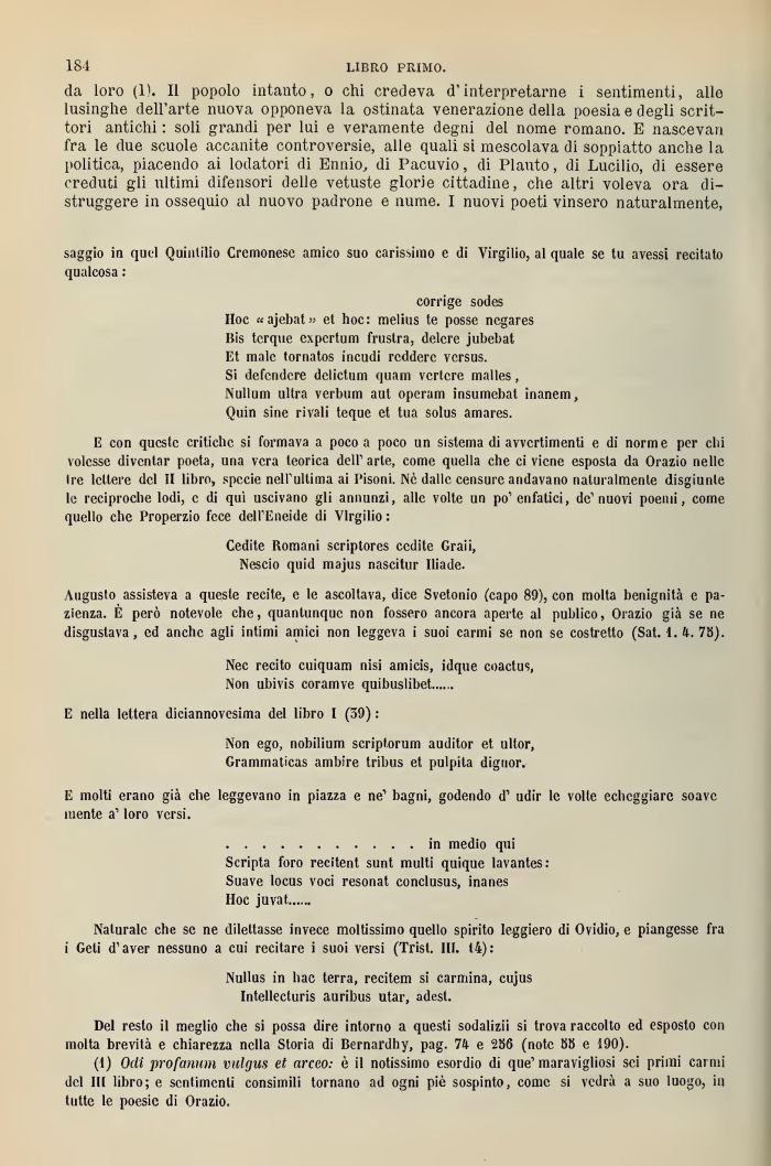 (1) Odi profanimi vulgus et arceo: è il notissimo esordio di que' maraviglisi sei primi canni del III libro; e sentimenti consimili tornano ad ogni più sospinto, come si vedrà a suo luogo, in tutte le poesie di Orazio.