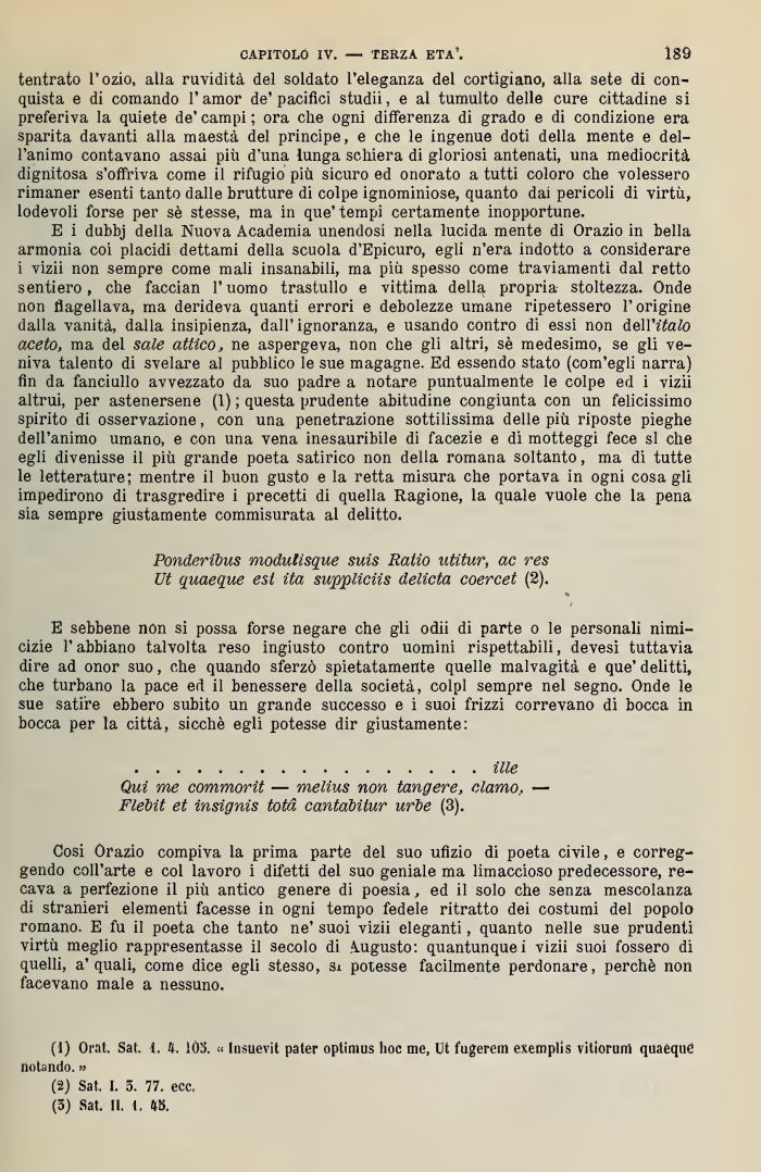 Cosi Orazio compiva la prima parte del suo uflzio di poeta civile, e correggendo coll'arte e col lavoro i difetti del suo geniale ma limaccioso predecessore, recava a perfezione il più antico genere di poesia, ed il solo che senza mescolanza di stranie elementi facesse in ogni tempo fedele ritratto dei costumi del popolo romano. E fu il poeta che tanto ne' suoi vizii eleganti, quanto nelle sue prudenti virtù meglio rappresentasse il secolo di Augusto: quantunque! vizii suoi fossero di quelli, a'quali, come d io egli stesso, si potesse facilmente perdonare, perchè non facevano male a nessuno.