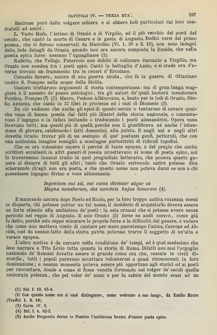 E mancando ancora dopo Nevio ed Ennio, per la loro troppo antica rozzezza messi in disparte, chi potesse portar un tal nome, il desiderio di acquistarlo doveva essere un forte stimolo alla ambizione de' poeti : la sola oramai che si potesse avere senza pericolo nel regno di Augusto. Il solo Orazio (5) forse ne andò scevro, come già fu detto, perchè solo seppe misurare le proprie forze e le difficoltà del genere, e vedere che come non metteva conto di cantare per mero passatempo Cadmo, Cecrope ed Alcide, cosi da nessun fatto della storia patria potevasi trarre il soggetto di un'alta e verace epopea.