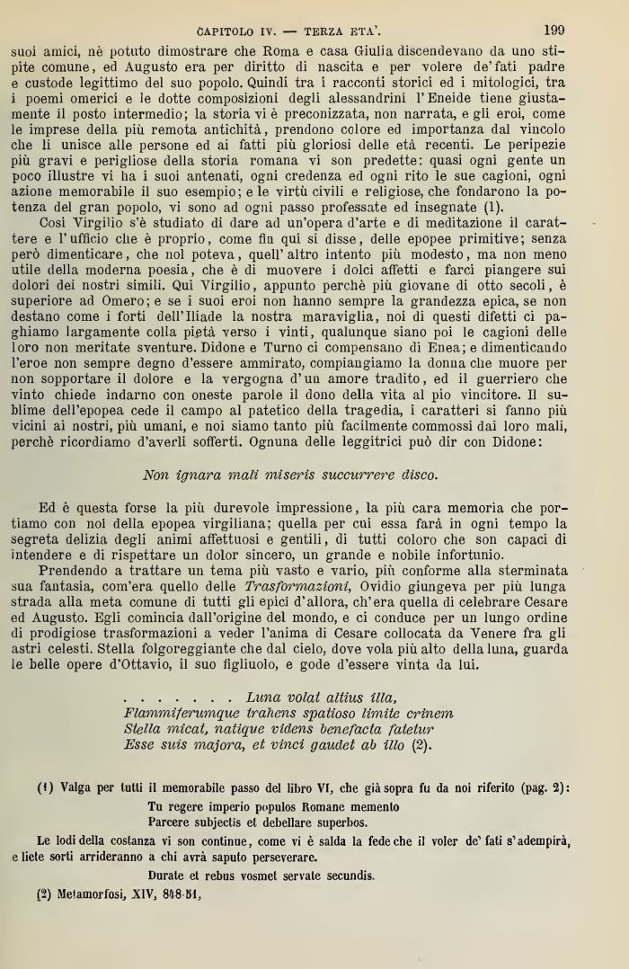 Ed è questa forse la più durevole impressione, la più cara memoria che portiamo con noi della epopea virgiliana; quella per cui essa farà in ogni tempo la segreta delizia degli animi affettuosi e gentili, di tutti coloro che son capaci di intendere e di rispettare un dolor sincero, un grande e nobile infortunio.
