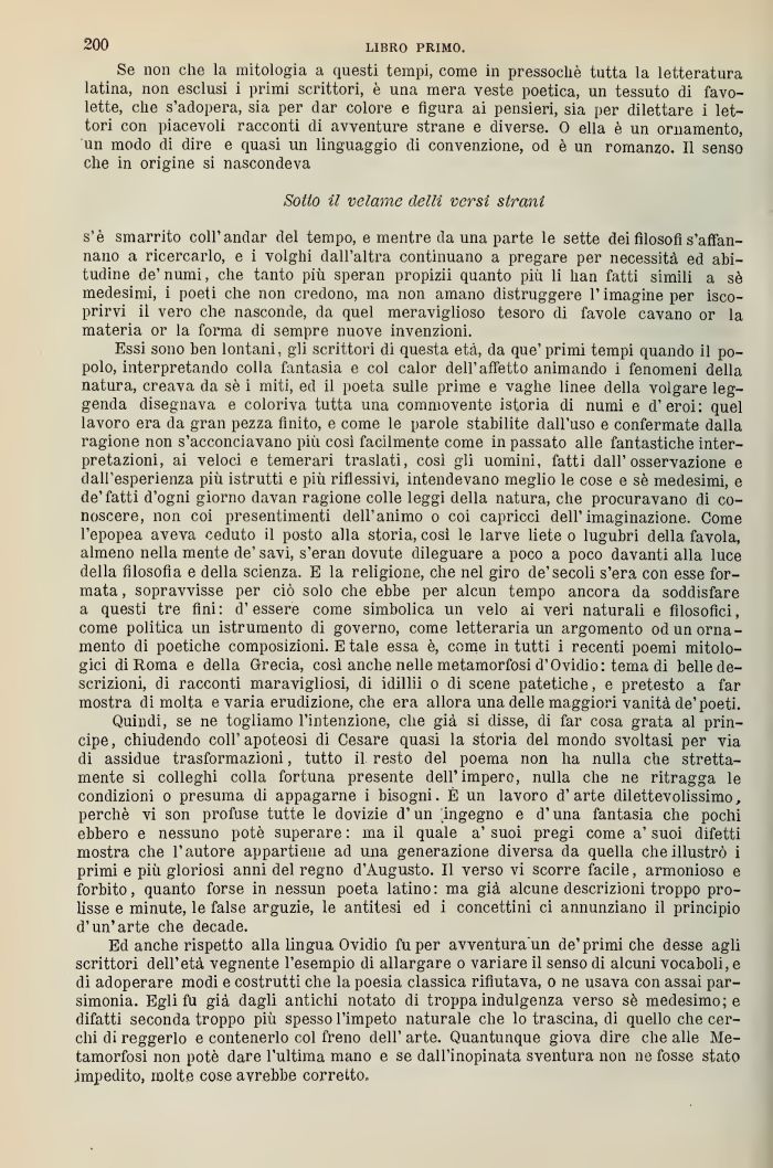 Essi sono ben lontani, gli scrittori di questa età, da que'primi tempi quando il popolo, interpretando colla fantasia e col calor dell'affetto animando i fenomeni della natura, creava da sè i miti, ed il poeta sulle prime e vaghe linee della volgare leggenda disegnava e coloriva tutta una commovente istoria di numi e d'eroi: quel lavoro era da gran pezza finito, e come le parole stabilite dall'uso e confermate dalla ragione non s'acconciavano più così facilmente come in passato alle fantastiche interpretazioni, ai veloci e temerari traslati, così gli uomini, fatti dall'osservazione e dall'esperienza più istrutti e più riflessivi, intendevano meglio le cose e sè medesimi, e de'fatti d'ogni giorno davan ragione colle leggi della natura, che procuravano di conoscere, non coi presentimenti dell'animo o coi capricci dell'imaginazione. Come l'epopea aveva ceduto il posto alla storiamosi le larve liete o lugubri della favola, almeno nella mente de' savi, s'eran dovute dileguare a poco a poco davanti alla luce della filosofìa e della scienza. E la religione, che nel giro de'secoli s'era con esse formata, sopravvisse per ciò solo che ebbe per alcun tempo ancora da soddisfare a questi tre fini: d'essere come simbolica un velo ai veri naturali e filosofici, come politica un istrumento di governo, come letteraria un argomento od un ornamento di poetiche composizioni. E tale essa è, come in tutti i recenti poemi mitologici «filloma e della Grecia, così anche nelle metamorfosi d'Ovidio: tema di belle descrizioni, di racconti maravigliosi, di idillii o di scene patetiche, e pretesto a far mostra di molta e varia erudizione, che era allora una delle maggiori vanità de'poeti.