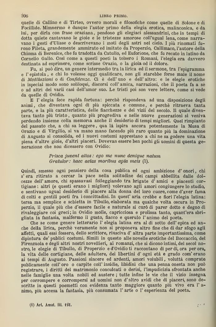 Quindi, smesso ogni pensiero della cosa publica ed ogni ambizione d' onori, chi s era ritirato a cercar la pace nella solitudine dei campi abbellita dalle dolcezze dell' amore, chi spassavasi folleggiando tra brigate d' amici e piacenti cortigiane : altri (e questi erano migliori) volevano agli amori congiungere lo studio, e sentivano ugual desiderio di piacere alla donna del loro cuore,.come d'aver fama di colti e gentili poeti fra i conc 'ladini. In quest'aria crebbe e fiorì l'elegia latina: tersa ma semplice e schietta in Tibullo, elaborata ma qualche volta oscura in Properzio, il quale più che d'essere facile e naturale si curò di parer dotto e degno di rivaleggiare coi greci ; in Ovidio molle, capricciosa e prolissa tanto, quant'era sbrigliata la fantasia, malfermo il gusto, fiacco e querulo 1' animo del poeta.