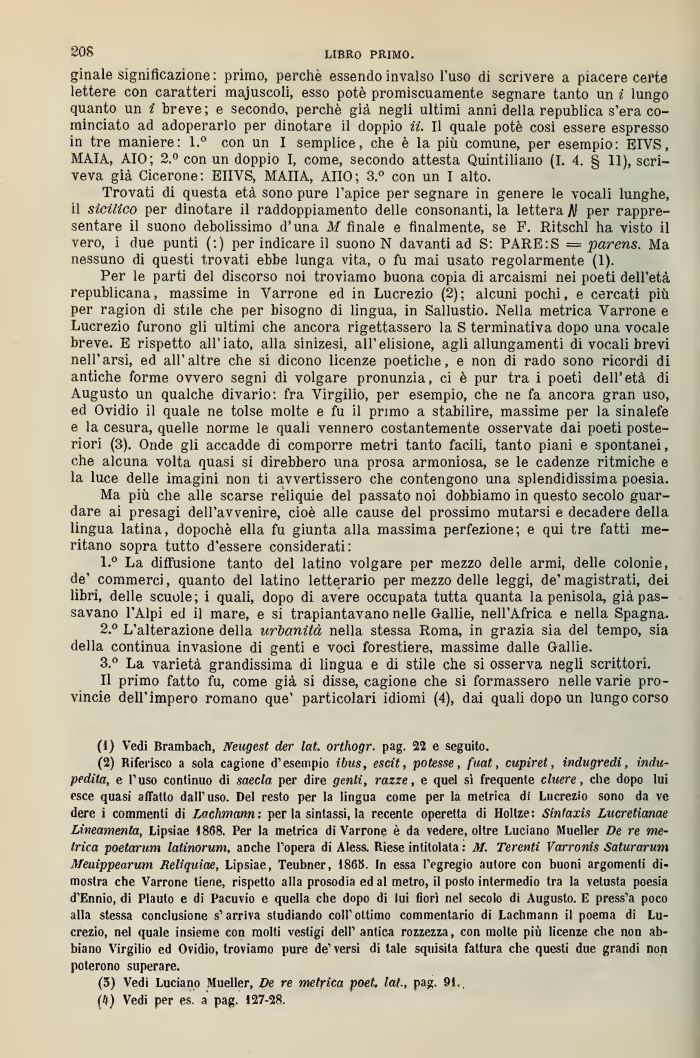 (2) Riferisco a sola cagione d'esempio ibus, escit, potesse, fuat, cupiret, indugredi, ìndu-peaita, e l'uso continuo di saecla per dire genti, razze, e quel sì frequente clnere, che dopo li esce quasi affatto dall'uso. Del resto per la lingua come per la metrica di Lucrezio sono da ve dorè ì commenti di Lachmann: per la sintassi, la recente operetta di Holtze: Sintaxis Lucretiame Lineamenta, Lipsiae 1868. Per la metrica di Varrone è da vedere, olire Luciano Mueller De re metrica poetarmi latinorum, anche l'opera di Aless. Riese intitolata M. Terenti Varronis Saturarum Meuippearum Tìeliquiae, Lipsiae, Teubner, 186B. In essa l'egregio autore con buoni argomenti dimostra che Varrone tiene, rispetto alla prosodia ed al metro, il posto intermedio tra la vetusta poesia d'Ennio, di Plauto e di Pacuvio e quella che dopo di lui fiorì nel secolo di Augusto. E press'a poco alla stessa conclusione s'arriva studiando coli'ottimo commentario di Lachmann il poema di Lucrezio, nel quale insieme con molti vestigi dell' antica rozzezza, con molte più licenze che non abbiano Virgilio ed Ovidio, troviamo pure de'versi di tale squisita fattura che questi due grandi mm poterono superare.