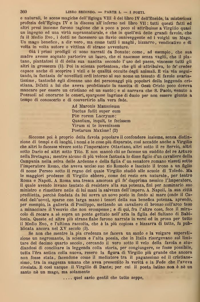 Se non che mentre la pia credenza ne faceva un santo e la volgare superstizione un negromante, la scienza e l'alta poesia, che in Italia risorgevano sul 1. ni-tare del decimo quarto secolo, cercando il vero sotto il velo della favola e studiandosi di conciliare la leggenda colla storia, per conj ungere, se fosse possibile, tutta l'èra antica colla nuova, resero la figura di Virgilio più grande che ancora non fosse stata, facendone come il mediatore tra il paganesimo ed il cr: 'ane-simo, tra la saggezza umana che avea presentito la verità e la Fede che l'aveva rivelata. E così nacque il Virgilio di Dante; per cui il poeta latino non è nè un santo nè un mago, ma solamente
