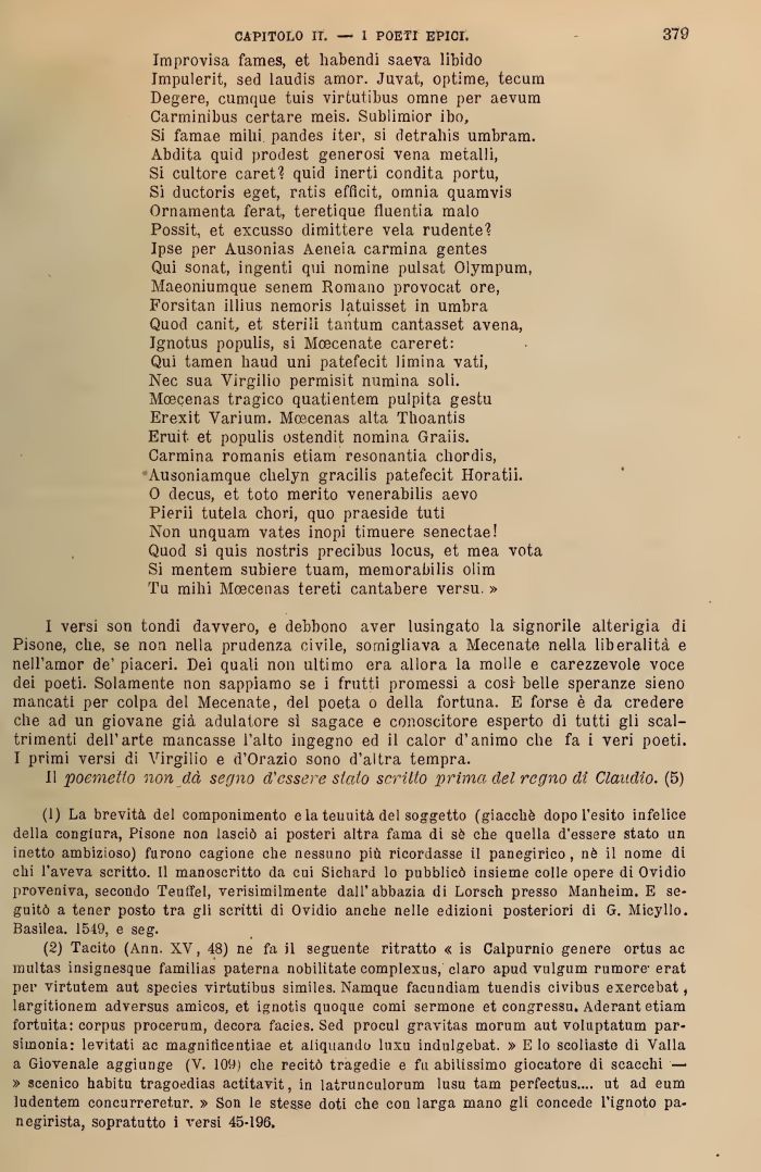 I versi son tondi davvero, e debbono aver lusingato la signorile alterigia di Pisone, che, se non nella prudenza civile, somigliava a Mecenate nella liberalità e nell'amor de' piaceri. Pei quali non ultimo era allora la molle e carezzevole voce dei poeti. Solamente non sappiamo se i frutti promessi a così- belle speranze Sieno mancati per colpa del Mecenate, del poeta o della fortuna. E forse è da credere che ad un giovane già adulatore sì sagace e conoscitore esperto di tutti gli scal-trimenti dell'arte mancasse l'alto ingegno ed il calor d'animo che fa i veri poeti. I primi versi di Virgilio e d'Orazio sono d'altra tempra.