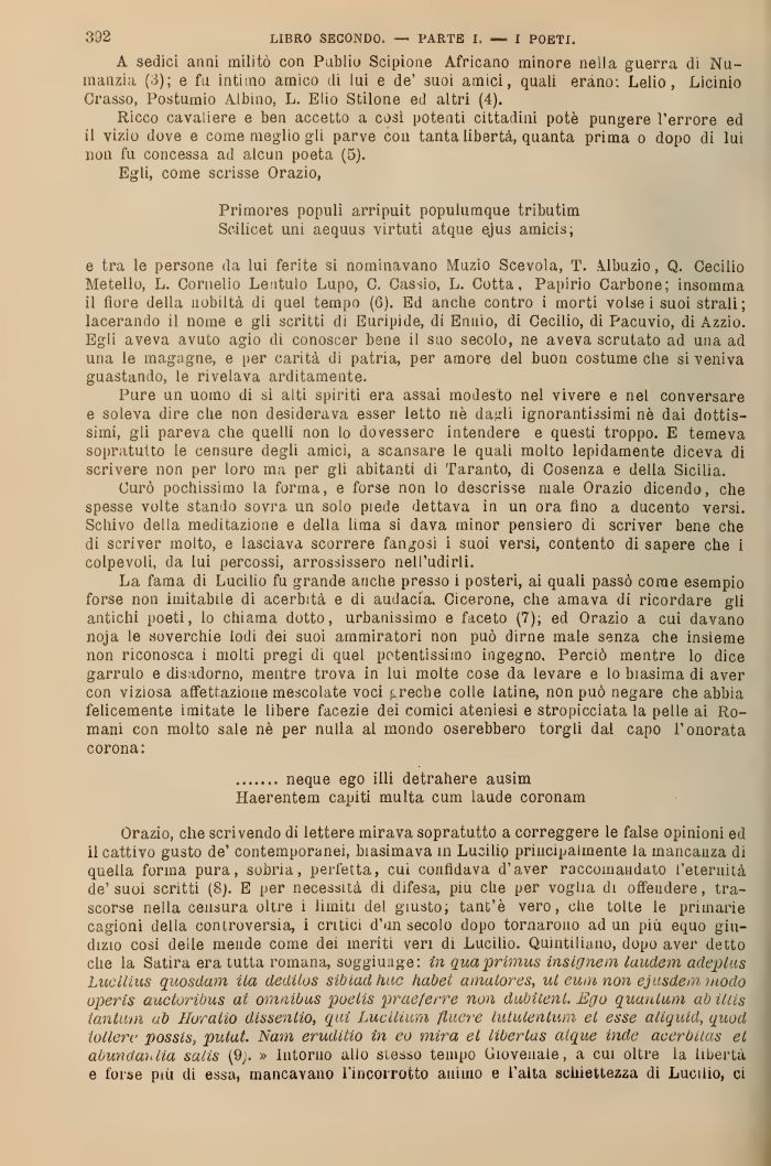 La fama di Lucilio fu grande anche presso i posteri, ai quali passò come esempio forse non imitabile di acerbità e di audacia. Cicerone, che amava di ricordare gli antichi poeti, lo chiama dotto, urbanissimo e faceto (7); ed Orazio a cui davano noja le soverchie lodi dei suoi ammiratori non può dirne male senza che insieme non riconosca i molti pregi di quel potentissimo ingegno. Perciò mentre lo dice garrulo e disadorno, mentre trova in lui molte cose da levare e lo biasima di aver con viziosa affettazione mescolate voci greche colle latine, non può negare che abbia felicemente imitate le libere facezie dei comici ateniesi e stropicciata la pelle ai Romani con molto sale nè per nulla al mondo oserebbero torgli dal capo l'onorata corona: