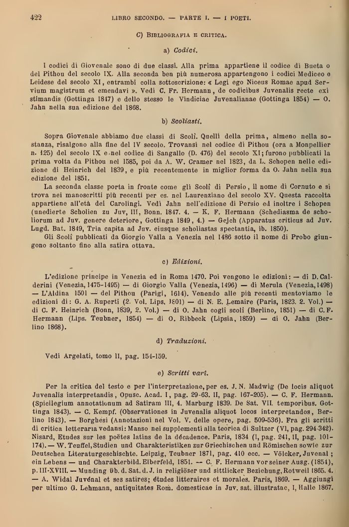 Per la critica del testo e per l'interpretaz'one, por es. J. N. Madwig (De locis aliquot Juvenalis interpretandis, Opusc. Acad. I, pag, 29-63. II, pag. 167-205). — C. F. Hermann. (Spicilegium annotationum ad Satiram III, 4. Marburg 1839, De Sat. VII. temporibus. Gottinga 1843). — C. Kempf. (Observationes in Juvenalis aliquot locos interpretandos, Berlino 1843). — Borghesi (Annotazioni nel Voi. V. delle opere, pag. 509-536). Fra gli scritti di critica letteraria vedansi: Manso nei supplementi alla teorica di Sultzer (VI, pag. 294-342). Nisard, Etudes sur les poétes latins de la décadence. Paris, 1834 (I, pag. 241, II, pag. 101174). — W. Teuffel,Studien und Charakteristiken zur Griechischen und llumischen sovvie zur Deutschen Literaturgeschischto. Leipzig, Toubner 1871, pag. 410 ecc. — Volcker, Juvenal ; einLebens— und Charakterbild. Elberfeld, 1851. — (, F. Hermann vor seiner Ausg. (1854), p. Ili-XVIII. — Munding i)b. d. Sat. d. J. in religiòser und sittlicker Beziehung,Rotweil 1865.4.