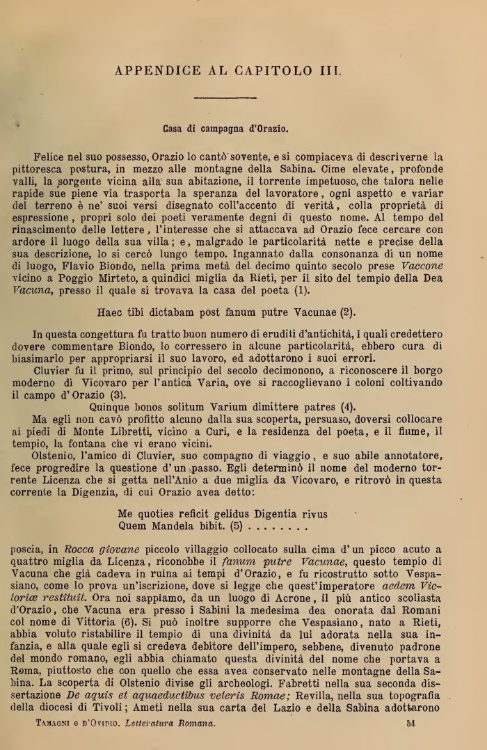 Felice nel suo possesso, Orazio lo cantò' sovente, e si compiaceva di descriverne la pittoresca postura, in mezzo alle montagne della Sabina. Cime elevate, profonde valli, la sorgente vicina alla sua abitazione, il torrente impetuoso, elle talora nelle rapide sue piene via trasporta la speranza del lavoratore , ogni aspetto e variar del terreno è ne' suoi versi disegnato coll'accento di verità, colla proprietà di espressione , propri solo dei poeti veramente degni di questo nome. Al tempo del rinascimento delle lettere, l'interesse che si attaccava ad Orazio fece cercare con ardore il luogo della sua villa ; e, malgrado le particolarità nette e precìse della sua descrizione, lo si cercò lungo tempo. Ingannato dalla consonanza di un nome di luogo, Flavio Biondo, nella prima metà del decimo quinto secolo prese Vaccone vicino a Poggio Mirteto, a quindici miglia da III et i, per il sito del tempio della Dea Vacuna, presso il quale si trovava la casa del poeta (1).