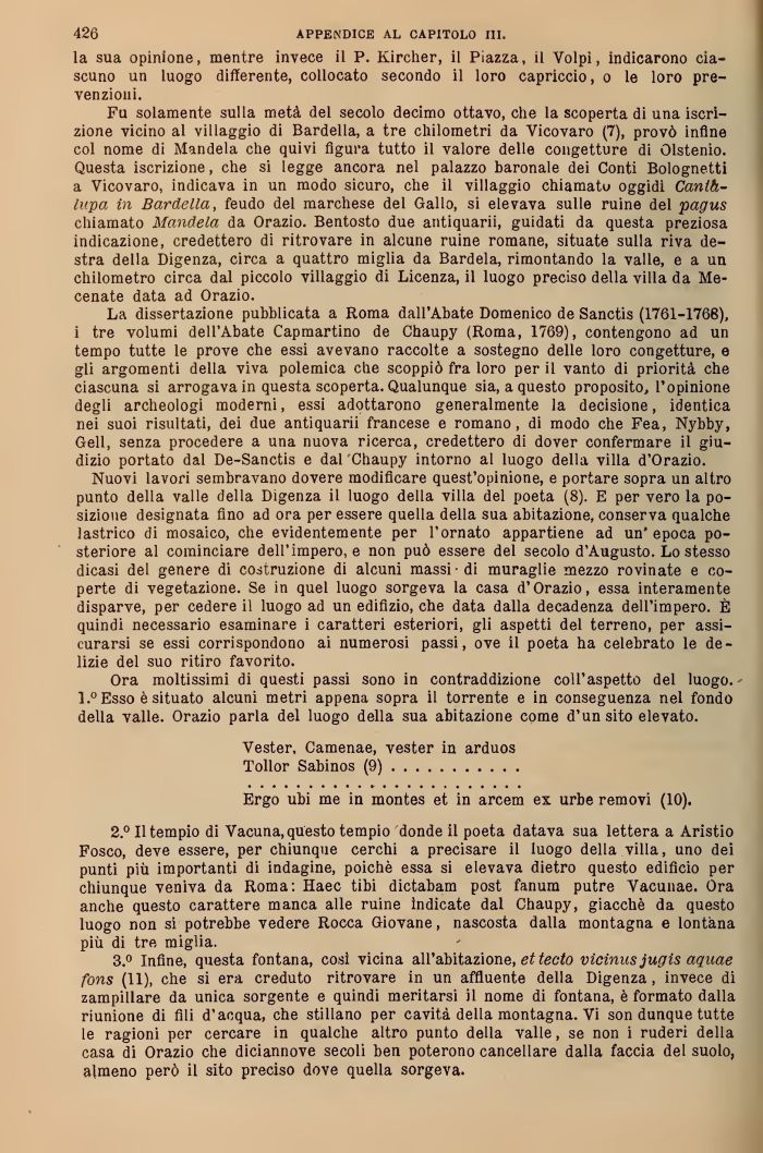 3.° Infine, questa fontana, così vicina all'abitazione, etiecto vicinusjugis aquae fons (11), che si era creduto ritrovare in un affluente della Digenza , invece di zampillare da unica sorgente e quindi meritarsi 1 nome di fontana, è formato dalla riunione di fili d'acqua, che stillano per cavità della montagna. Vi son dunque tutte le ragioni per cercare in qualche altro punto della valle, se non i ruderi della casa di Orazio che diciannove secoli ben poterono cancellare dalla faccia del suolo, almeno però il sito pieciso dove quella sorgeva.