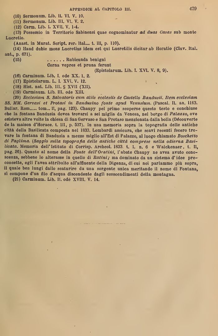 che la fontana Bandusia dovea trovarsi a sei miglia da Venosa, nel borgo di Palazzo, ove esisteva altre volte la chiesa di San Gervaso e San Protaso menzionata dalla bolla (Découverte de la maison d'Uorace. t. Ili, p. 537). In una memoria sopra la topografia delle antiche città della Basilicata composta nel 1833. Lombardi assicura, che scavi recenti fecero trovare la fontana di Bandusia a mezzo miglio all'Est di Falazzo, al luogo chiamato Boschetto di Paglima. (Saggio sulla topografia delle antiche città comprese nella odierna Basilicata. Memoria dell'Istituto di Corrisp. Archeol. 1833. t. I. n. 6 e Walckenaer, t. II, pag. 26). Quanto al nome della Fonte dell'Oratini, l'abate Chaupy ne avea avuto conoscenza, sebbene lo alterasse in quello di Ratini; ma dominato da un sistema d'idee preconcette, egi l'avea attribuito all'affluente della Digenza, di cui noi parlammo più sopra, il quale ben lungi dallo scaturire da una sorgente unica meritando il nome di Fontana, si compone d'un filo d'acqua discendente dagli scoscendimenti della montagna.