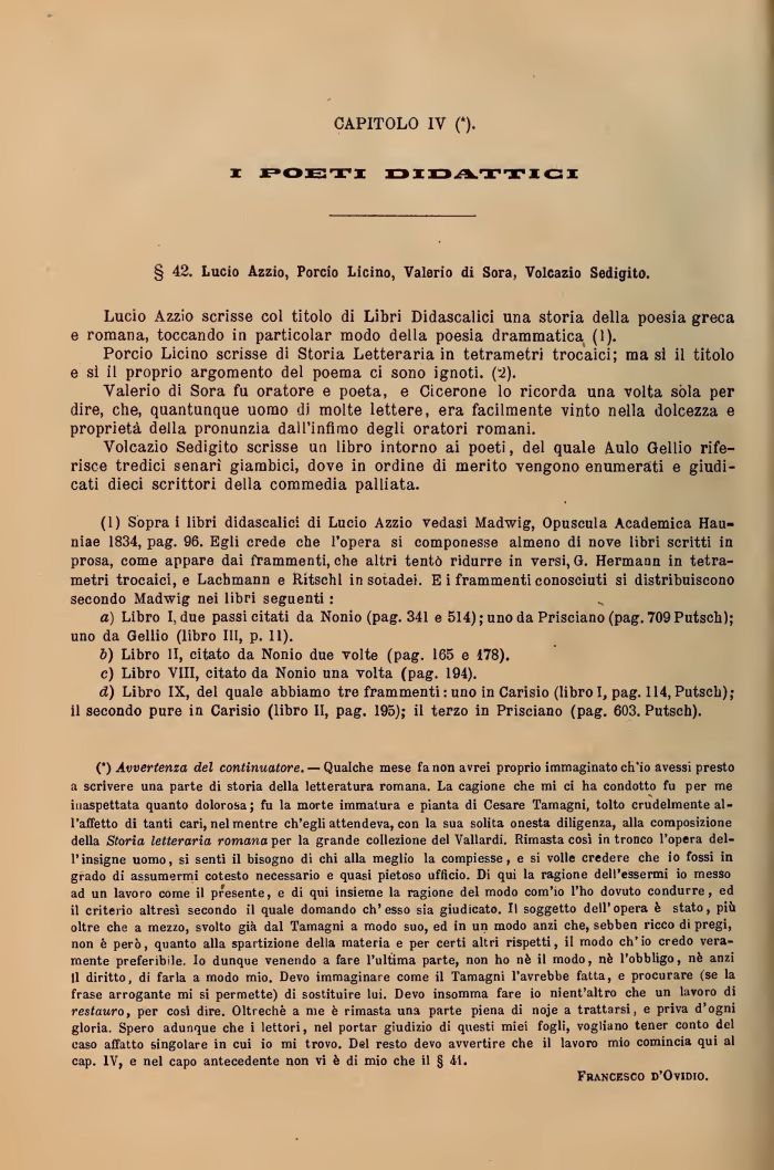 (*) Avvertenza del continuatore. — Qualche mese fa non avrei proprio immaginato ch'io avessi presto a scrivere una parte di storia della letteratura romana. La cagione che mi ci ha condotto fu per me inaspettata quanto dolorosa; fu la morte immatura e pianta di Cesare Tamagni, tolto crudelmente all'affetto di tanti cari, nel mentre ch'egli attendeva, con la sua solita onesta dii-'genza, alla compostone della Storia leiteraria romana per la grande collezione del Vallardi. Rimasta così in tronco l'opera dell'insigne uomo, si sentì il bisogno di chi alla meglio la compiesse, e si volle credere che io fossi n grado di assumerrr/ cotesto necessario e quasi pietoso ufficio. Di qui la ragione dell'esserr io messo a,d un lavoro come il presente, e di qui insieme la ragione del modo com'io l'ho dovuto condurre, ed il criterio altresì secondo il quale domando ch'esso sìa giudicato. Il soggetto dell'opera è stato, più oltre che a mezzo, svolto già dal Tamagni a modo suo, ed in un modo anzi che, sebben r eco d: pregi, aon è però, quanto alla spartizione della mateiia e per certi altri rispetti, il modo ch'io credo veramente preferibile. Io dunque venendo a fare l'ultima parte, non ho nè il modo, nè l'obbligo, nè an^i Il diritto, di farla a mudo mio. Devo immaginare come il Tamagni l'avrebbe fatta, e procurare (se la frase arrogante mi si permette) di sostituire lui. Devo insomma fare io nient'altro che un lavoro di restauro, per cosi dire. Oltreché a me ò rimasta una parte piena di nc-je a trattarsi, e priva d'ogni gloria. Spero adunque che i lettori, nel portar giudizio di questi miei fogli, vogliano tener conto del jaso affatto singolare in cui io mi trovo, Del resto devo avvertire che il lavoro mio cominci?, qui al cap. IV, e nel capo antecedente non vi è di mio che il § il.