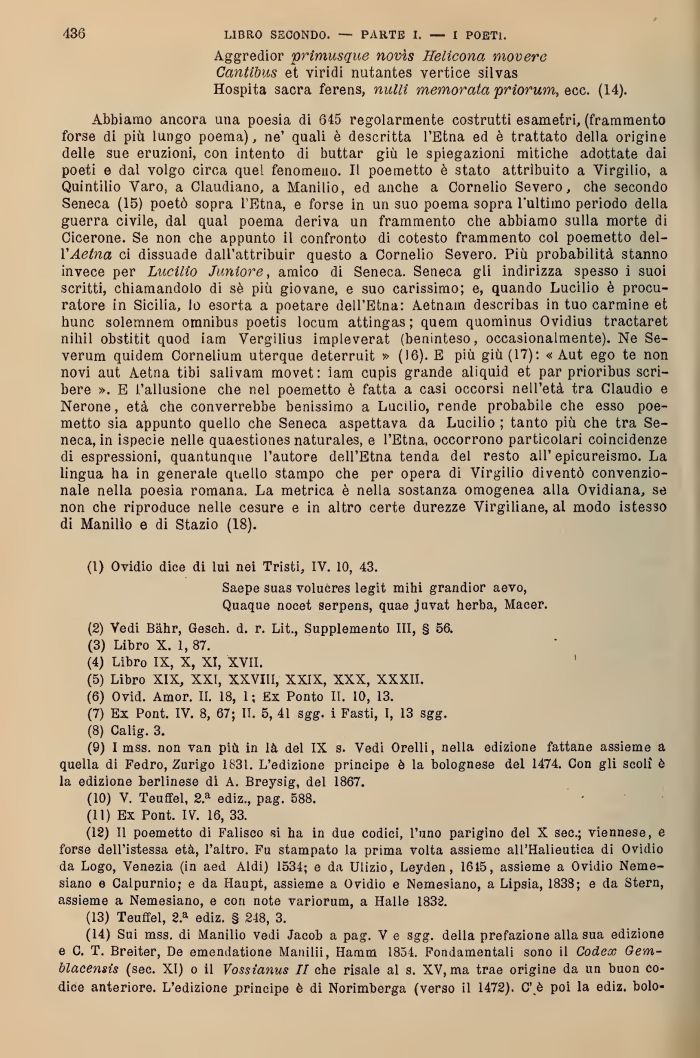 Abbiamo ancora una poesia di 645 regolarmente costrutti esametri, (frammento forse di più lungo poema), ne' quali è descritta l'Etna ed è trattato della origine delle sue eruzioni, con intento di buttar giù le spiegazioni mitiche adottate dai poeti e dal volgo circa quel fenomeno. U poemetto è stato attribuito a Virgilio, a Quintilio Varo, a Claudiano, a Manilio, ed anche a Cornelio Severo, che secondo Seneca (15) poetò sopra l'Etna, e forse in un suo poema sopra l'ultimo periodo della guerra civile, dal qual poema deriva un frammento che abbiamo sulla morte di Cicerone. Se non che appunto il confronto di cotesto frammento col poemetto del-VAetna ci dissuade dall'attribuir questo a Cornelio Severo. Più probabilità stanno invece per Lucilio Junior e, amico di Seneca. Seneca gli indirizza spesso i suoi scritti, chiamandolo di sè più giovane, e suo carissimo; e, quando Lucii.o è procuratore in Sicilia, lo esorta a poetare dell'Etna: Aetnam describas in tuo Carmine et hunc solemnem omnibus poetis locum attingas ; quem quominus Ovidius tractaret nihil obstitit quod iam Vergilius impleverat (beninteso, occasionalmente). Ne Se-verum quidem Cornelium uterque deterruit » (16). E più giù (17): «Aut ego te non novi aut Aetna tibi salivam movet: iam cupis grande aliquid et par prioribus scribere ». E l'allusione che nel poemetto è fatta a casi occorsi nell'età tra Claudio e Nerone, età che converrebbe benissimo a Lucilio, rende probabile che esso poemetto sia appunto quello che Seneca aspettava da Lucilio ; tanto più che tra Seneca, in ispecìe nelle quaestiones naturales, e l'Etna, occorrono particolari coincidenze di espressioni, quantunque l'autore dell'Etna tenda del resto all' epicureismo. La lingua ha in generale quello stampo che per opera 8 Virgilio diventò convenzionale nella poesia romana. La metrica è nella sostanza omogenea alla Ovid ma, se non che riproduce nelle cesure e in altro certe durezze Virgiliane, al modo istesso di Manilio e di Stazio (18).