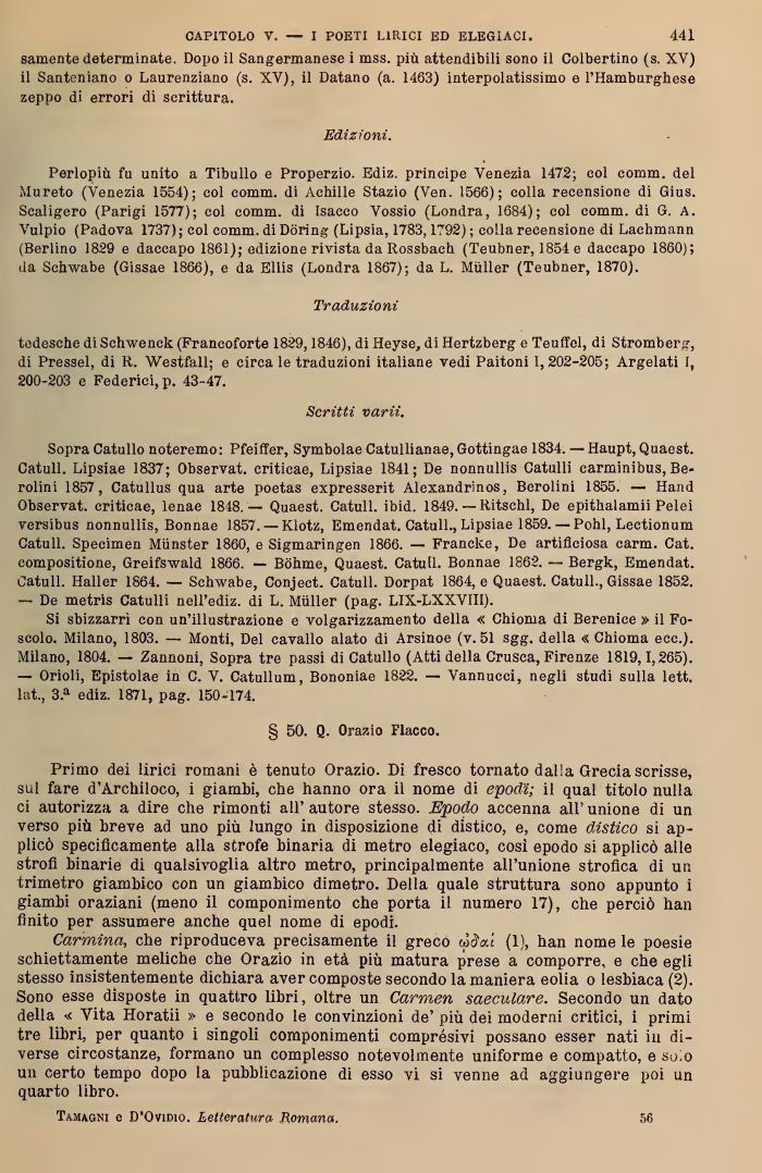 Sopra Catullo noteremo: Pfeiffer, Symbolae Catullianae, Gottingao 1834. ~ Haupt, Quaest. CatuU. Lipsiae 1837; Observat. cnticae, Lipsie 1841; De nonnullis Catulli carmmibus, Be» colini 1857 , Catullus qua art.3 poetas expresserit Alexandr'ncs, Berolini 1855 — Hand Observat. criticae, lenae 1818. — Quaest CatuU. ibid. 1849. — Ritschl, De epithalamii Pelei versibus nonDuliis, Bonn?,e 1857. — Klotz, Emendat. Catull., Lipsiae 1859. — Pohl, Lectionum Catull. Specimen Miinster 1860, e Sigmaringen 1866. — Francke, De artificiosa carni. Cat. compositione, Greifswald 1866. — Bóhme, Quaest Catull. Bonnae 1862. — Bergli, Emendat. Catull. Haller 1861. — Schwabe, Conject. Catull. Dorpat 1864, e Quaest. Catull., Gissae 1852.