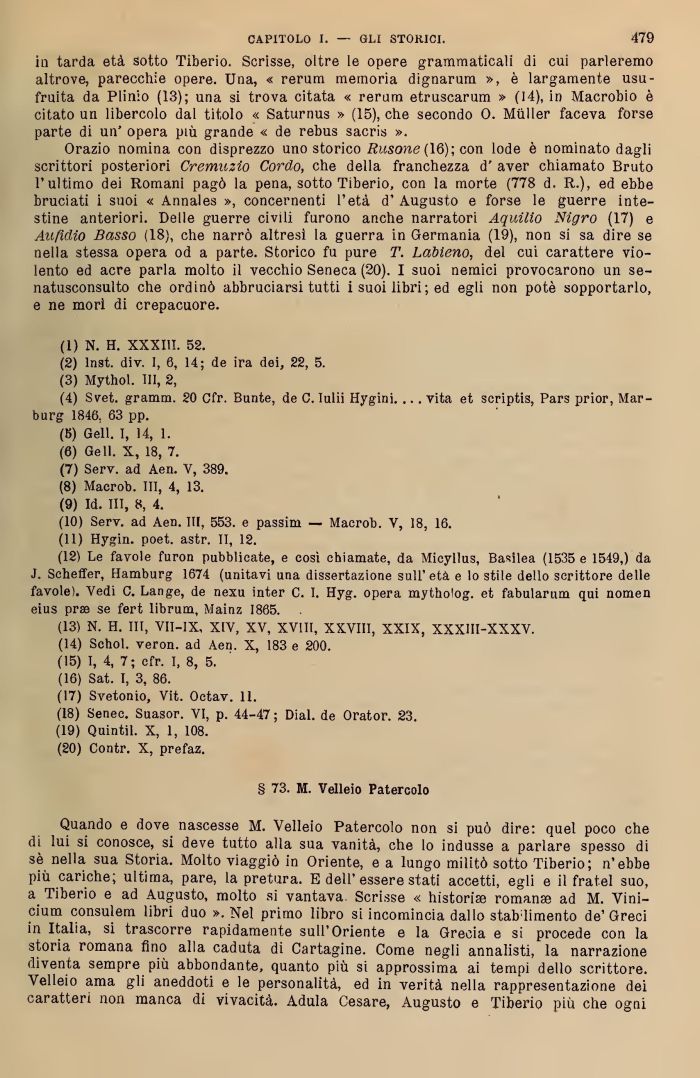 Quando e dove nascesse (ti. Velleio Patercoio non si può dire: quel poco che di lui si conosce, si deve tutto alla sua vanità, che lo indusse a parlare spesso di sè nella sua Stor a. Molto viaggiò in Oriente, e a lungo militò sotto Tiberio; n'ebbe più cariche; ull ma, pare, la pretura. E dell'essere stati accetti, egli e il fratel suo, a Tiberio e ad augusto, molto si vantava. Scrisse « historise romana ad M. Vini-cium consulem libri duo ». Nel primo libro si incomincia dallo stabdimento de'Greci in le aia, si trascorra rapidamente sull'Oriente e la Grecia e si procede con la storia romana fino alla caduta di Cartagine. Come negli annalisti, la narrazione di nta sempr più abbondante, quanto più si approssima ai tempi dello scrittore relleio ama gli aneddoti e le personalità, ed in verità nella rappresentazione dei caratteri non manca di vivacità. Adula Cesare, Augusto e Tiberio più che ogni