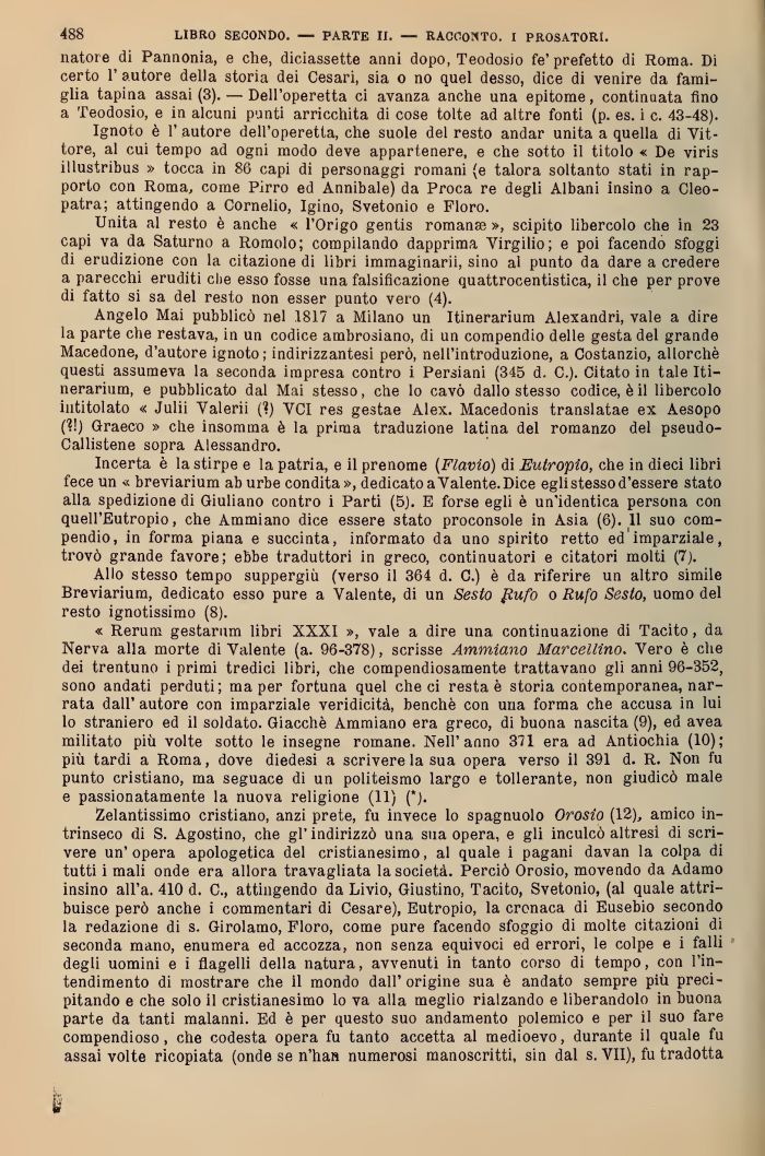 Incerta è la stirpe e la patria, e il prenome (Flavio) di Eutropio, che in dieci libri fece un « breviarium ab urbe condita», dedicato a Valente. Dice egli stesso d'essere stato alla spedizione di Giuliano contro i Parti (5). E forse egli è un'identica persona con quell'Eutropio, che Ammiano dice essere stato proconsole in Asia (6). 11 suo compendio, in forma pana e succinta, informato da uno spirito retto ed imparziale, trovò grande favore; ebbe traduttori in greco, continuatori e citatori molti (7).