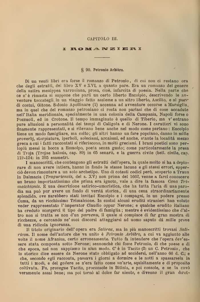 Di un venti libri era forse il romanzo di Petronio , di cui non ci restano ora che degli estratti, del libro XV e XVI, a quanto pare. Era un romanzo del genere della satira menippea varroniana, prosa, cioè, infarcita di poesia. Nella parte che ce n' è rimasta si suppone che parli un certo liberto Encolpio, descrivendo le avventure toccategli.in un viaggio fatto assieme a un altro liberto, Ascillo, e al puer di costui, Gitone. Sidonio Apollinare (1) accenna ad avventure occorse a Marsiglia, ma in quel che del romanzo petroniano ci resta non parlasi che di cose accadute nell'Italia meridionale, specialmente in una colonia della Campania, Napoli forse o Pozzuoli, ed in Crotone. Il tempo immaginato è quello di Tiberio, ma v'entrano pure allusioni a personalità dei tempi di Caligola e di Nerone. I caratteri vi sono finamente rappresentati, e si rilevano bene anche nel modo come parlano : Encolpio tiene un modo famigliare, ma colto; gli altri hanno un fare popolano, danno in mille proverbj, storpiature, iperboli, solecismi, arcaismi, ed anche, stante la località mezzo greca a cui i fatti raccontati si riferiscono, in molti grecismi. I brani poetici sono perlopiù messi in bocca a Eumolpo, poeta senza gusto; come particolarmente la presa di Troja (Trojae halosis, cap. 89) in 65 senarii, e la guerra civile (beli, civile, cap. 119-124) in 295 esametri.